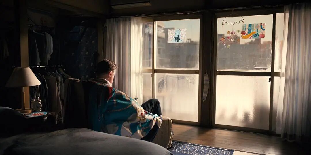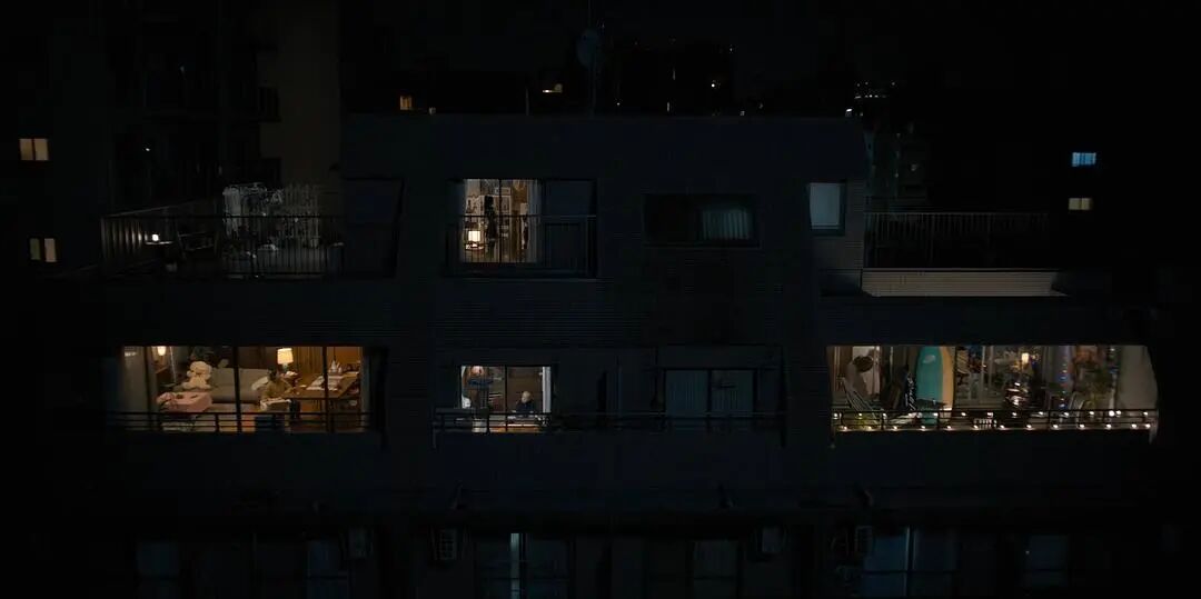 此刻他靠在东京狭小公寓的窗前,看着对面楼里的陌生人无声的生活:有人独自吃饭,有人对着屏幕发呆,有人深夜仍在忙碌。这扇窗像一块冰冷的电影银幕,映着别人的琐碎日常,而他自己,则是这场无声戏剧里唯一的观众,孤独得无处遁形。