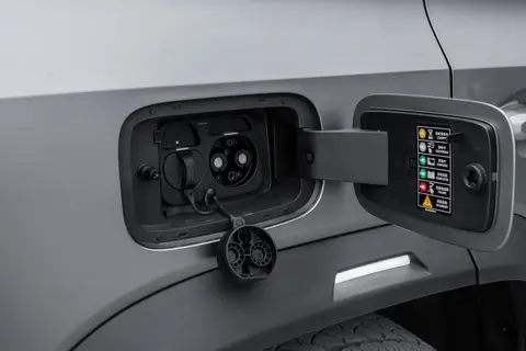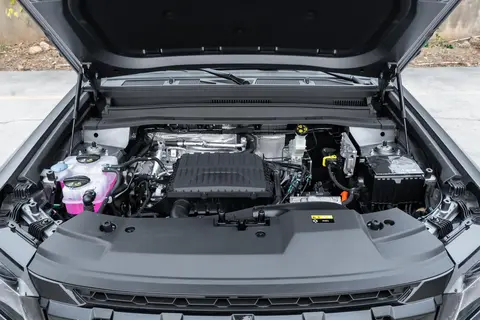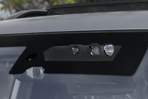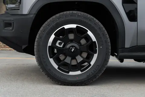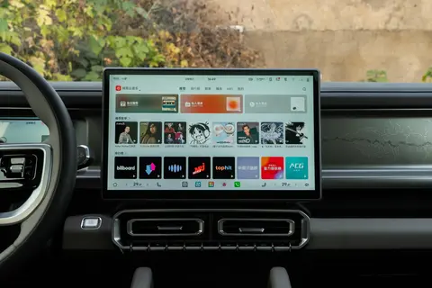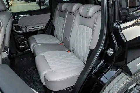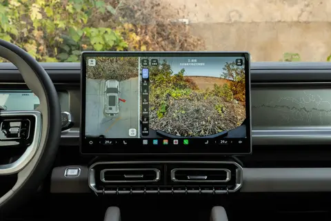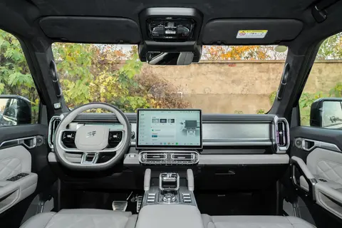 拉开车门,硬派气息得以延续,但更多了一份精致。座舱采用T型平直布局,保留了必要的物理按键,这在越野颠簸路段时显得尤为可靠。车内设置了9处力量型拉手,方便乘员抓握。高配车型使用的麂皮材质包裹中控台,搭配豪车同款的座椅菱形格缝线,触感和视觉质感都超出了对这个价位车型的预期。64英寸全景大天窗带来了近乎敞篷的视野体验,白天可观云卷云舒,夜晚能赏星空点点。引人注目的莫过于15.6英寸2.5K中控巨幕,显示效果清晰细腻。屏幕下方新增的物理按键及换挡杆后方优化过的按键布局,让操作更加直观便捷。