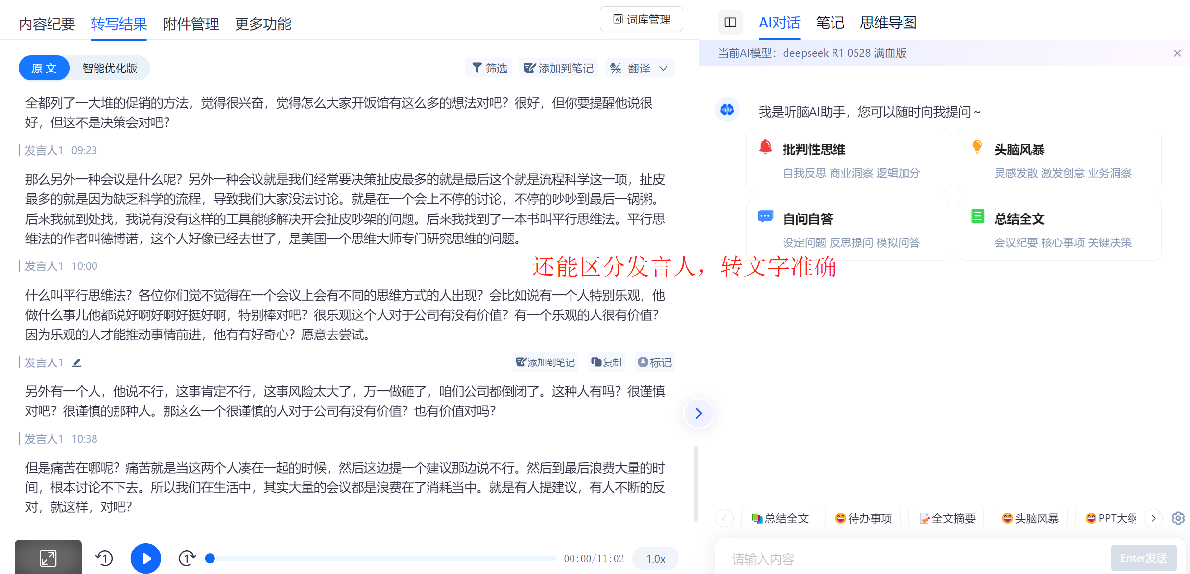 算下来,用对工具后效率提升很明显。以前整理 2 小时的会议记录,加上后续的纪要梳理,至少要花 2 个多小时,现在不到 10 分钟就能完成,节省下来的时间可以专注做更重要的事。更重要的是,不用再为漏记、错记而焦虑,也减少了很多不必要的精神内耗。
