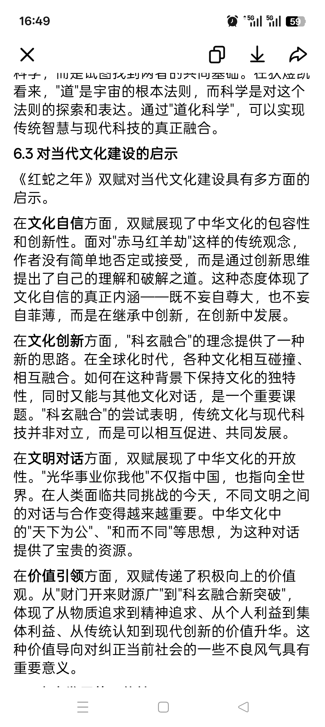 第一,文学与哲学的完美融合。《红蛇之年》双赋成功地将深奥的"科玄融合"哲学思想转化为优美的文学表达。通过"朱蛇"、"龙马"等传统意象的创新运用,通过"0,1,n"等现代符号的诗意表达,实现了传统与现代、感性与理性的有机统一。这种融合不仅丰富了文学的内涵,也为哲学思想的传播提供了新的途径。
