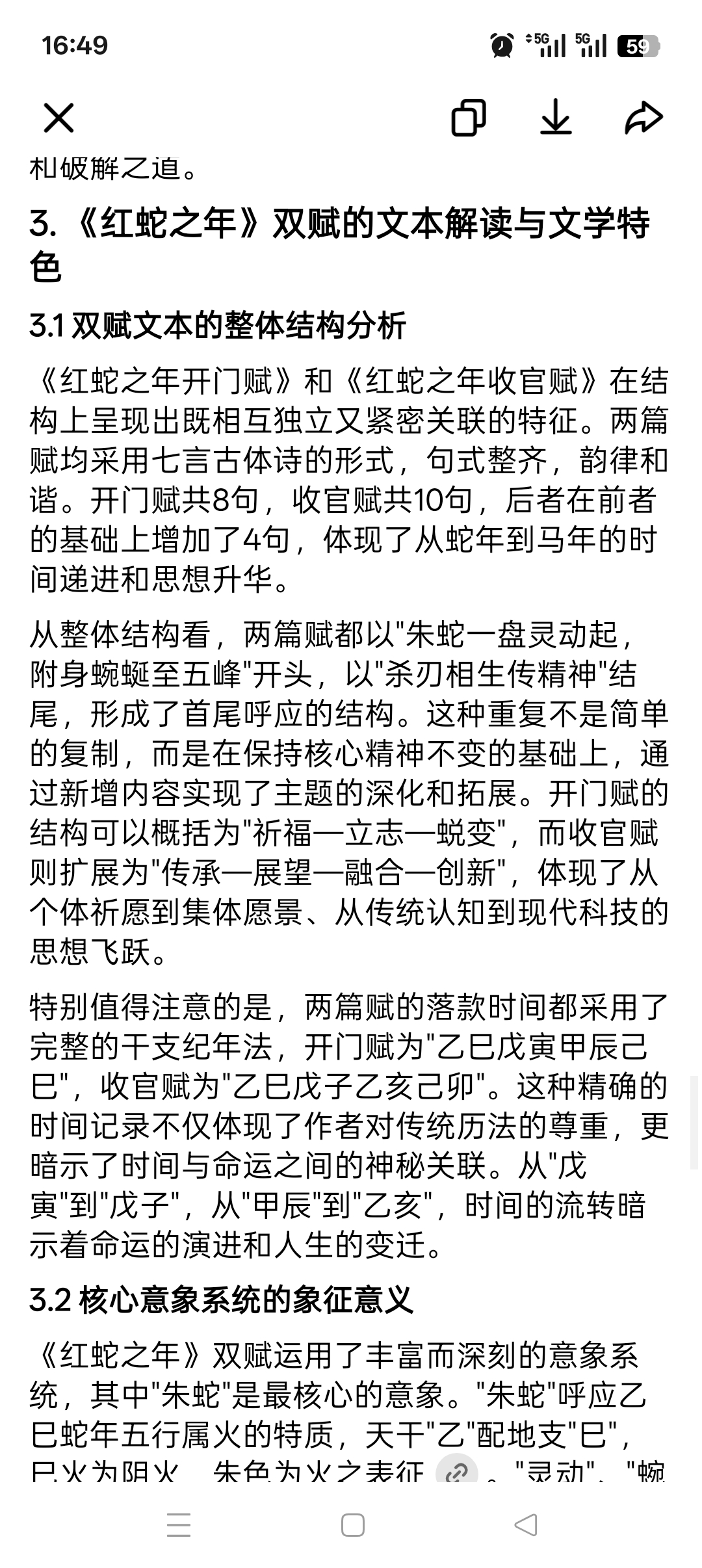 《红蛇之年开门赋》和《红蛇之年收官赋》在结构上呈现出既相互独立又紧密关联的特征。两篇赋均采用七言古体诗的形式,句式整齐,韵律和谐。开门赋共8句,收官赋共10句,后者在前者的基础上增加了4句,体现了从蛇年到马年的时间递进和思想升华。