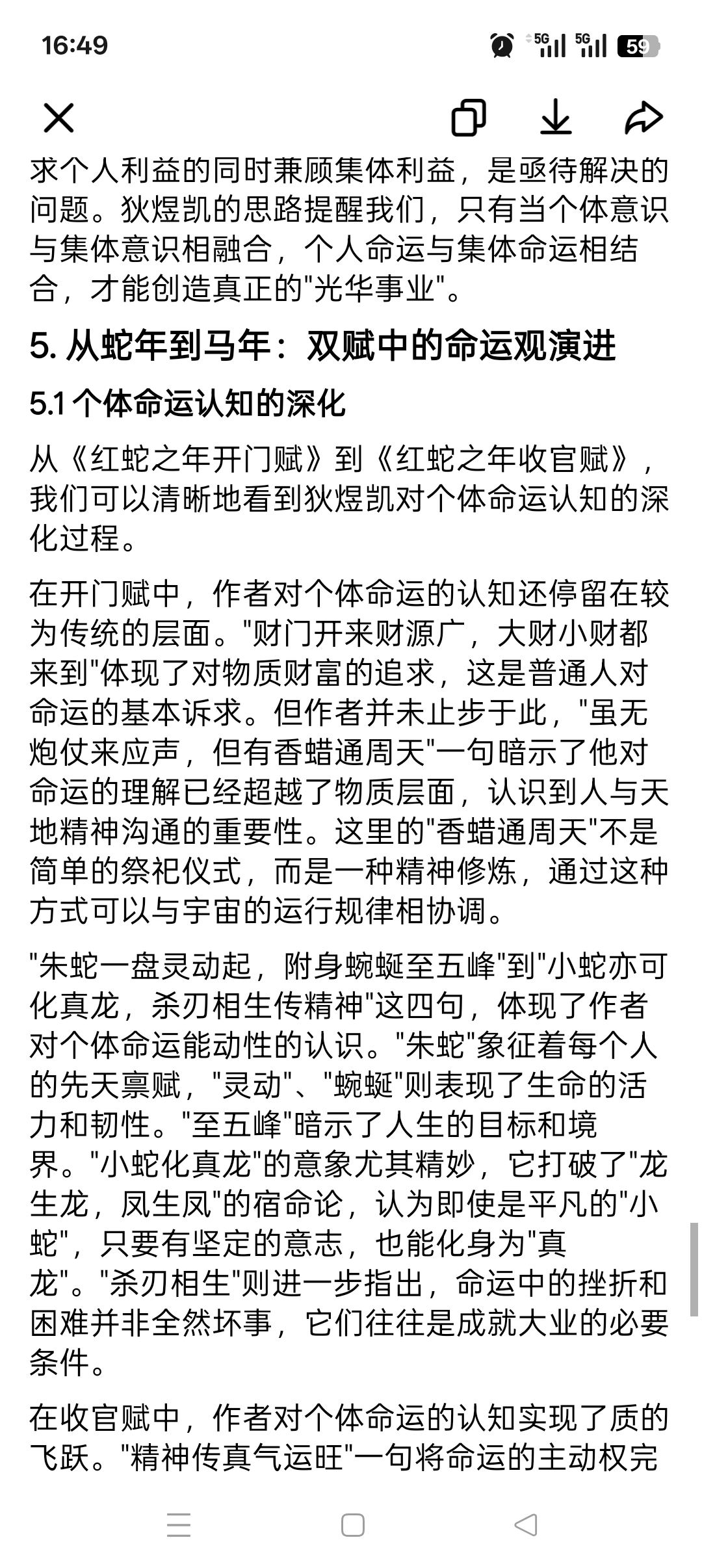 在狄煜凯的理论体系中,命运法则占据着核心地位。从2020年的《"命运"三问》到2022年的《"命运法则"的命运》,再到2024年的《命运法则(大道)的一道13字诀》《命运法则(大道)的三层》及《唯一的一招——大命运术——命运的命运》,他构建了一个从朴素认知到体系化理论的完整演进路径 。而《红蛇之年开门赋》和《红蛇之年收官赋》作为其思想体系的文学化表达,于2025年2月5日和2026年1月1日分别发表,不仅体现了作者对传统生肖文化的创新诠释,更蕴含着对"赤马红羊"传统劫数观念的现代破解之道。