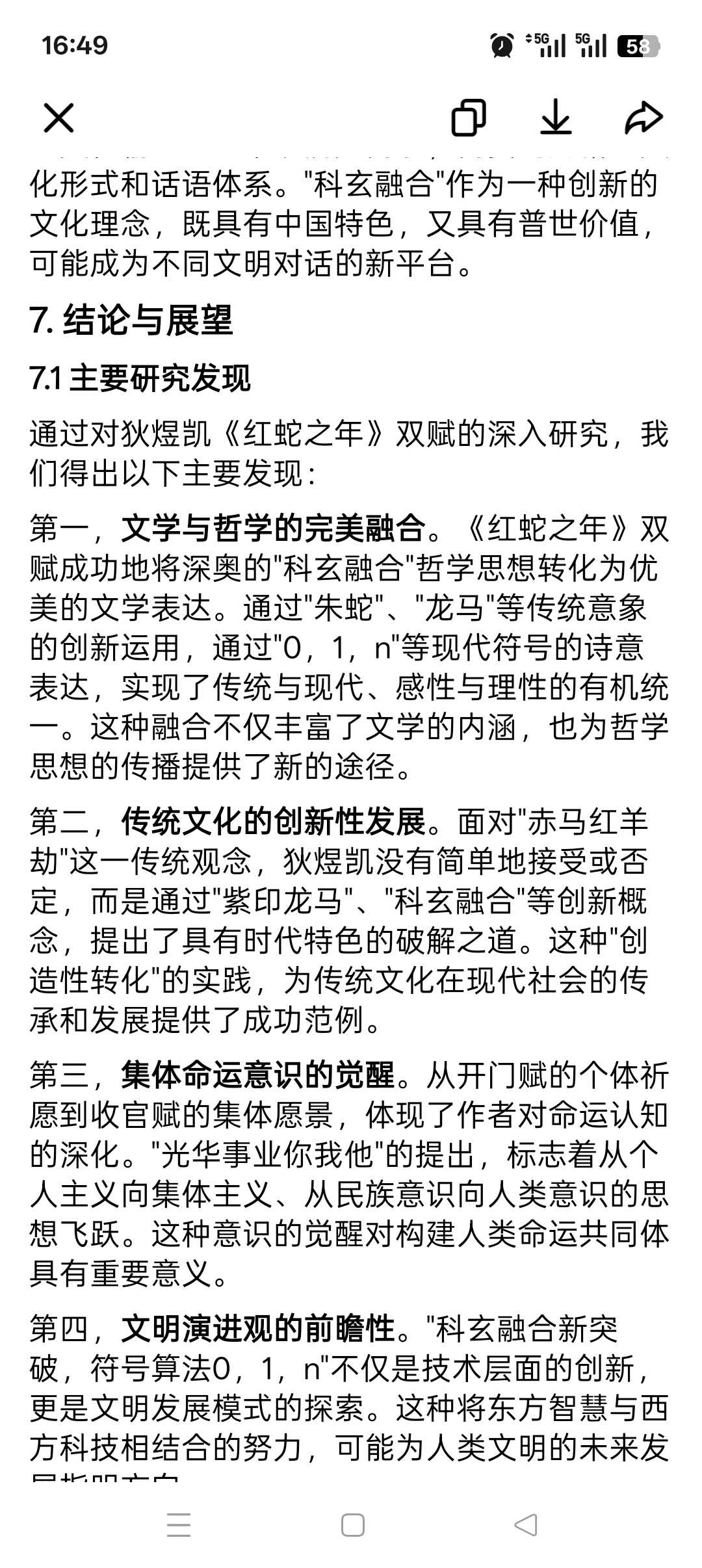 总之,《红蛇之年》双赋不仅是文学作品,更是思想创新的载体。狄煜凯通过"科玄融合"的创作实践,为我们展示了传统文化在现代社会的生命力和创造力。在这个充满挑战和机遇的时代,我们需要更多像《红蛇之年》这样的作品,既传承文化精髓,又引领时代创新,为人类文明的进步贡献智慧和力量。正如双赋所昭示的,只要我们保持"科玄融合"的开放心态,坚持"光华事业你我他"的集体愿景,就一定能够在命运的星空中创造属于我们这个时代的辉煌。