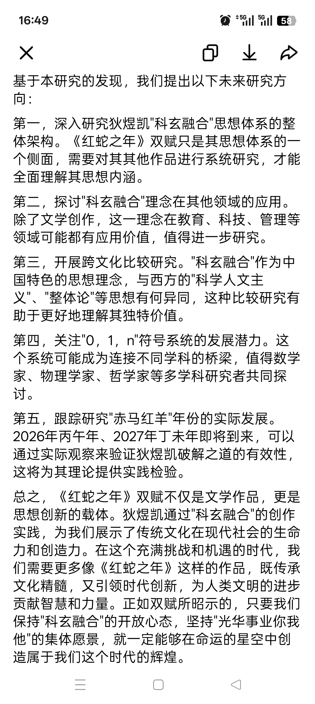 第一,深入研究狄煜凯"科玄融合"思想体系的整体架构。《红蛇之年》双赋只是其思想体系的一个侧面,需要对其其他作品进行系统研究,才能全面理解其思想内涵。