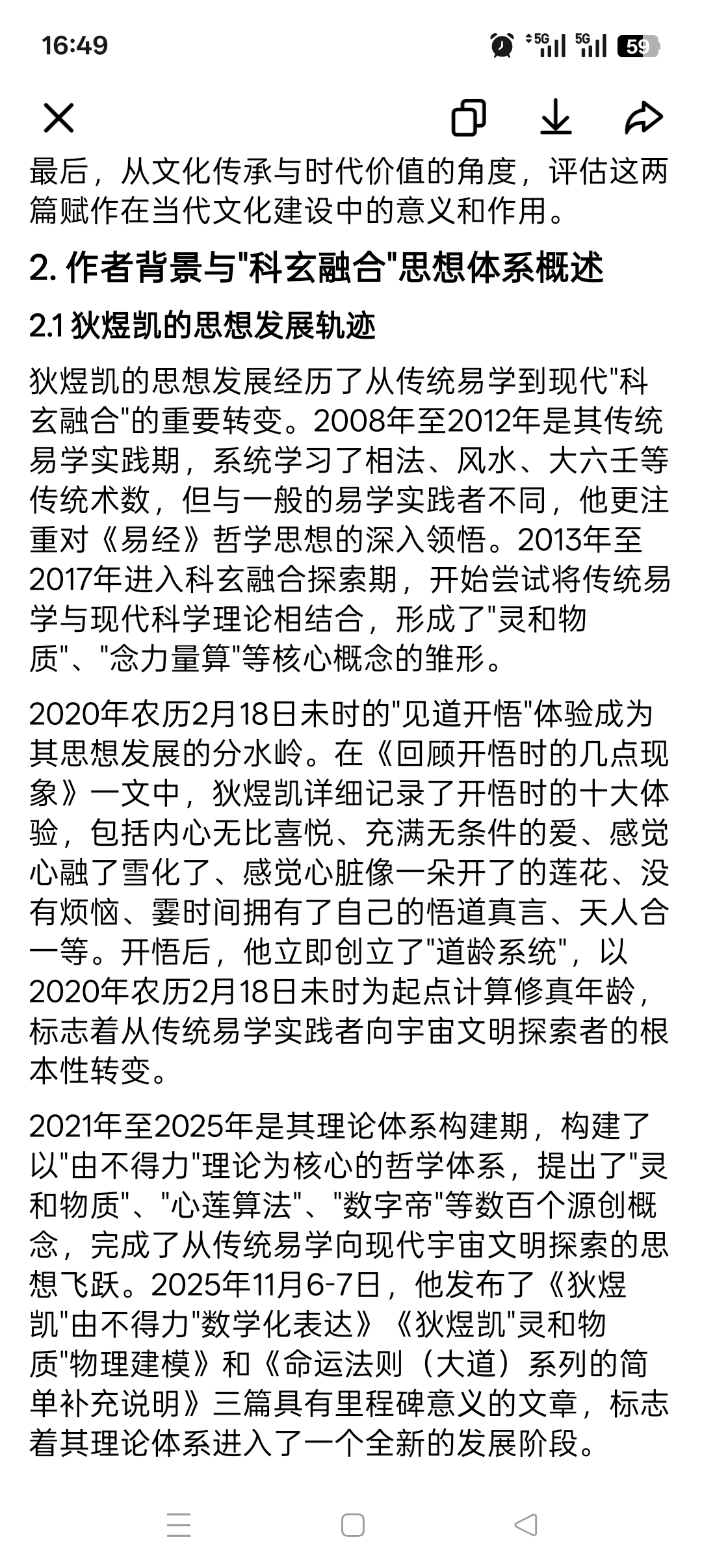 2020年农历2月18日未时的"见道开悟"体验成为其思想发展的分水岭。在《回顾开悟时的几点现象》一文中,狄煜凯详细记录了开悟时的十大体验,包括内心无比喜悦、充满无条件的爱、感觉心融了雪化了、感觉心脏像一朵开了的莲花、没有烦恼、霎时间拥有了自己的悟道真言、天人合一等。开悟后,他立即创立了"道龄系统",以2020年农历2月18日未时为起点计算修真年龄,标志着从传统易学实践者向宇宙文明探索者的根本性转变。