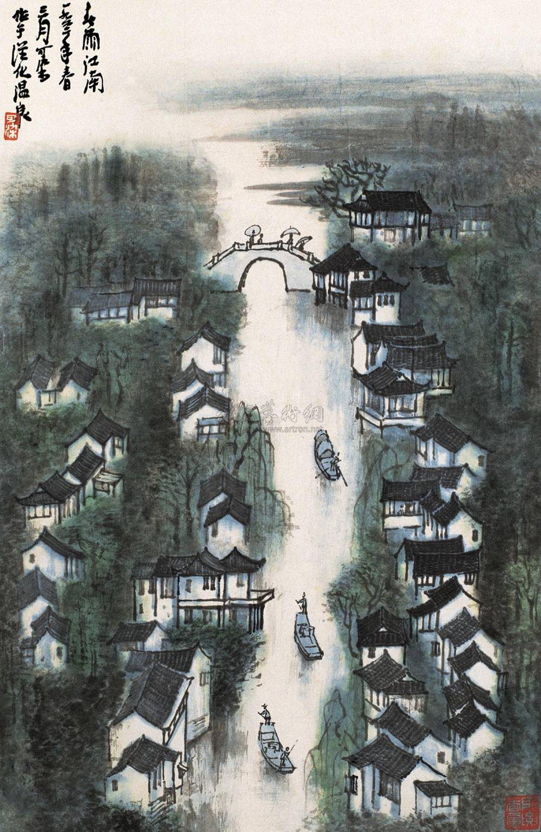 1984年所作《春雨江南图》,李可染时年七十七,笔墨趋于老辣松灵。构图左虚右实,奇中见正;景物较早期减少,留白增加,呈现“以少胜多”之境。