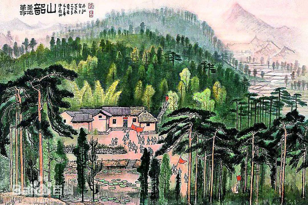 笔墨特征:以积墨、晕染写满山苍翠,辅以皴笔;受光面罩以汁绿,显得“温润清亮、苍翠欲滴”。逆光法运用臻于极致:背光面浓墨积染,受光处留白或施淡赭,营造晨雾初散、霞光万道之景,赋予革命题材以神圣光辉。