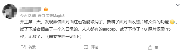 年前,微信小范围灰度测试了面对面收发文件功能,它和苹果的 AirDrop 一样,可以实现近距离、免流量的文件传输,同时还解决了跨平台无法互传的痛点。