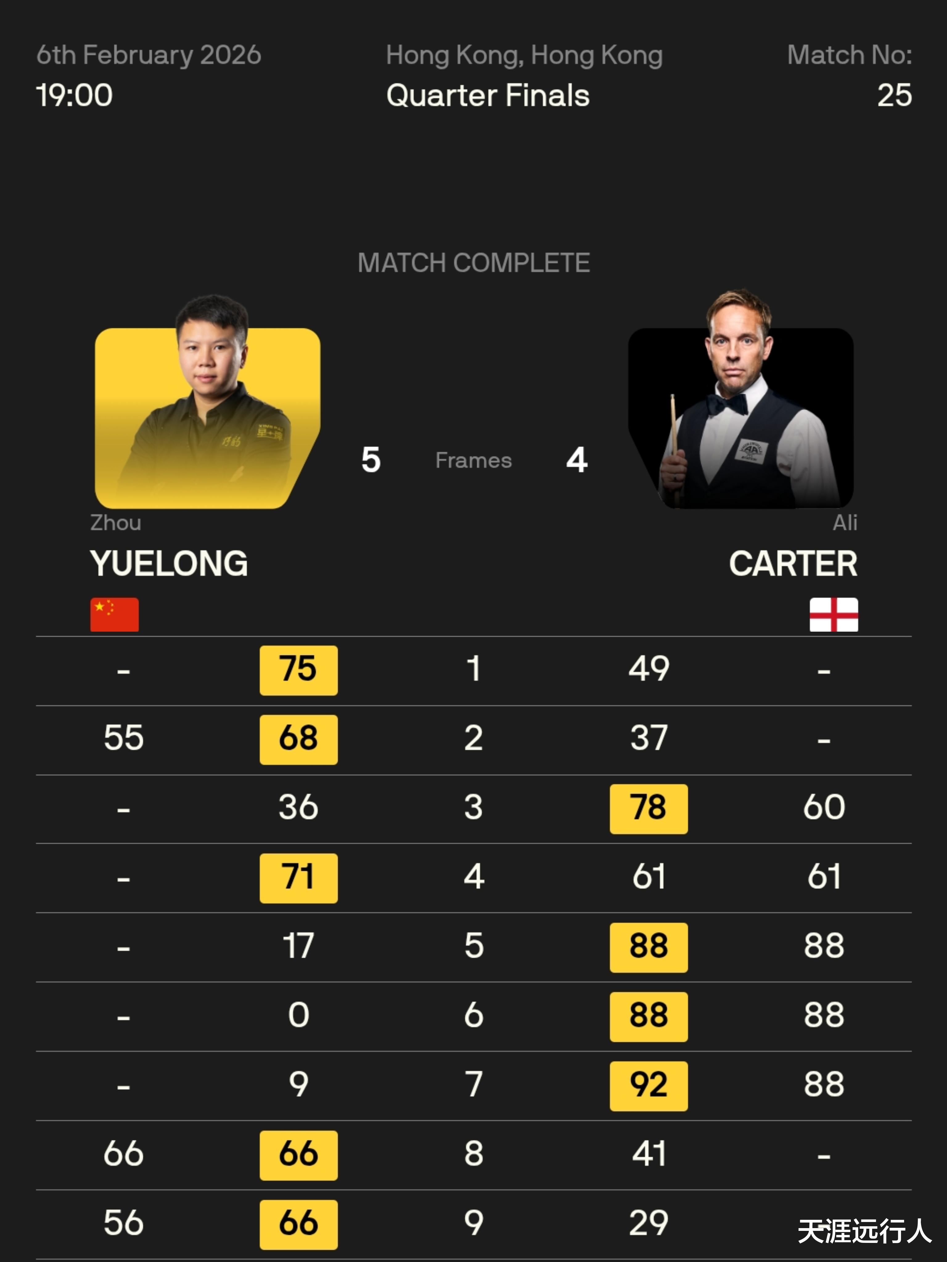 局休回来,卡特连打三杆单杆88,一波三连鞭,逆转先达赛点,周跃龙没有崩,稳稳收纳后两局,为中国军团完成包揽排名赛四强的最后一个拼图。