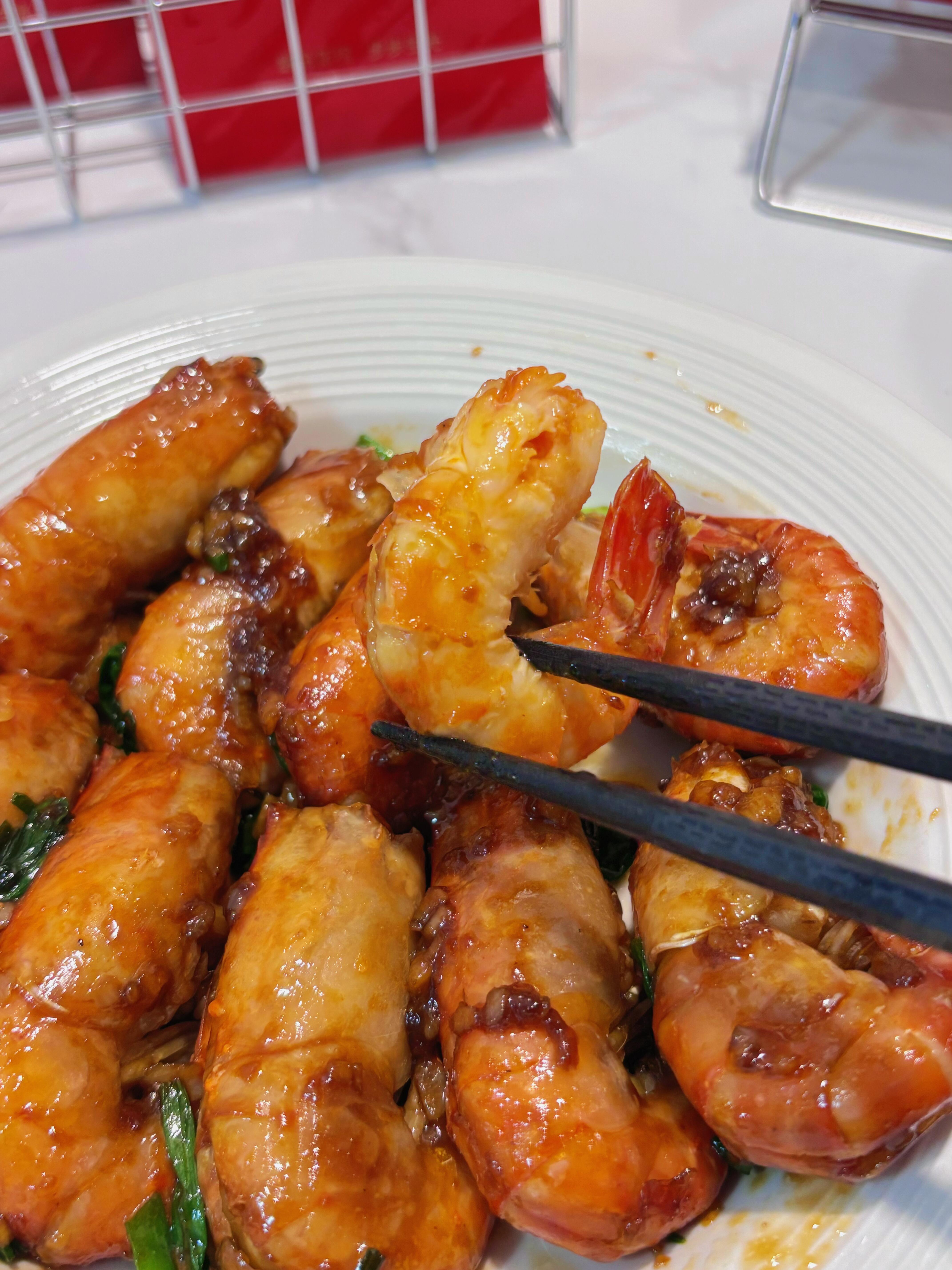 装盘时把虾头朝外圈摆成圆形,中间堆上葱段,像极了一盘闪闪发光的金币,年夜饭端上桌绝对是C位!夹起一只虾,轻轻一剥,虾壳“咔嚓”裂开,露出雪白Q弹的虾肉,蘸一点盘底的酱汁送进嘴里——先是黄油蒜香的浓郁,然后是虾肉的鲜甜,最后是酱汁的回甘,连虾壳都想嚼碎吃掉。老妈尝了第一口就笑眯了眼:“这虾比我做的还入味,以后年夜饭这道菜就交给你了!”