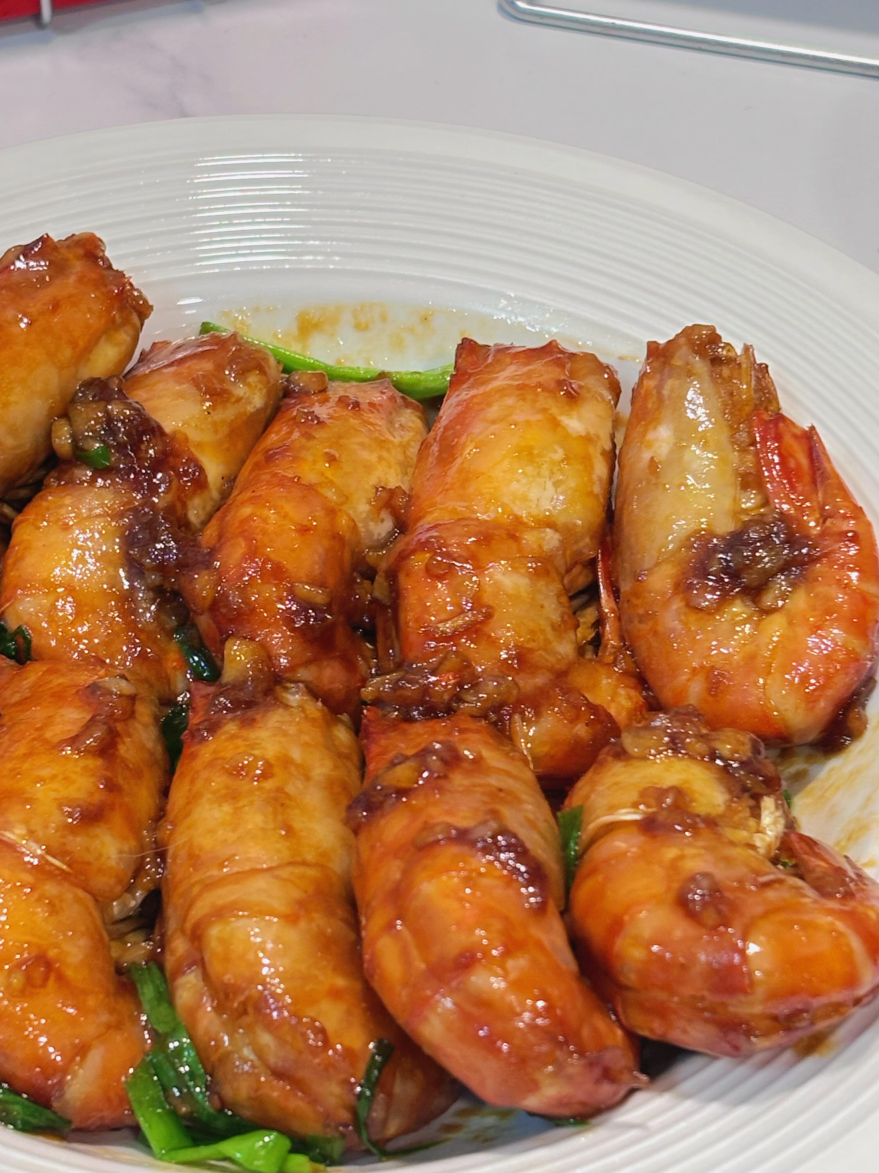 蒜末炒到微黄时,把煎好的虾倒回锅里,快速翻炒两下,让每只虾都裹上蒜香。接着倒入调好的酱汁,大火煮开后转中小火焖2分钟,让虾充分吸收酱汁的味道。这时候别盖锅盖,看着酱汁慢慢收浓,虾身裹上红亮的糖色,厨房里全是甜丝丝的酱香,口水都要流下来了!撒一把葱段,翻炒10秒就能出锅。