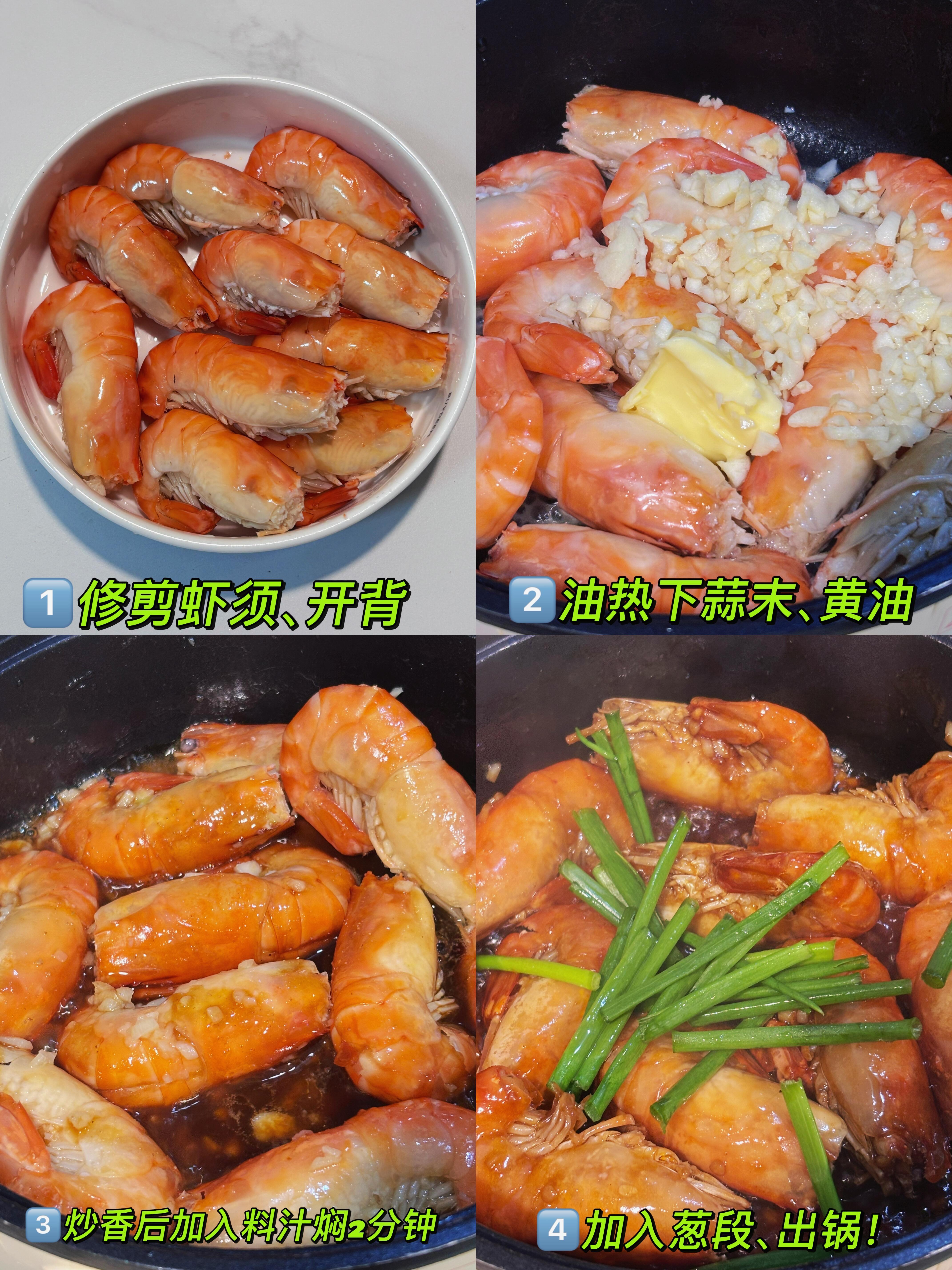 开火热锅,倒少许油,油温六成热时转中小火,把虾平铺在锅里。煎虾的时候别心急,先煎带壳的一面,煎到虾壳变红变焦黄,翻面煎另一面,直到虾身卷成“C”形,像小元宝一样鼓起来。这一步能逼出虾油,让虾壳更酥脆,虾肉更紧实。煎好的虾先盛出来,锅里留底油,下一大把蒜末(越多越香!),丢一块黄油,小火慢慢炒出香味——黄油和蒜末简直是神仙搭配,香味能飘满整个厨房,路过的老公都忍不住进来问:“今晚做什么大菜?”