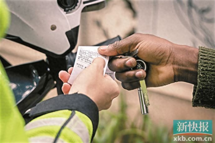 ■广州交警对违法车辆开罚单。