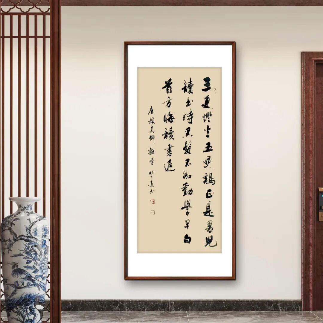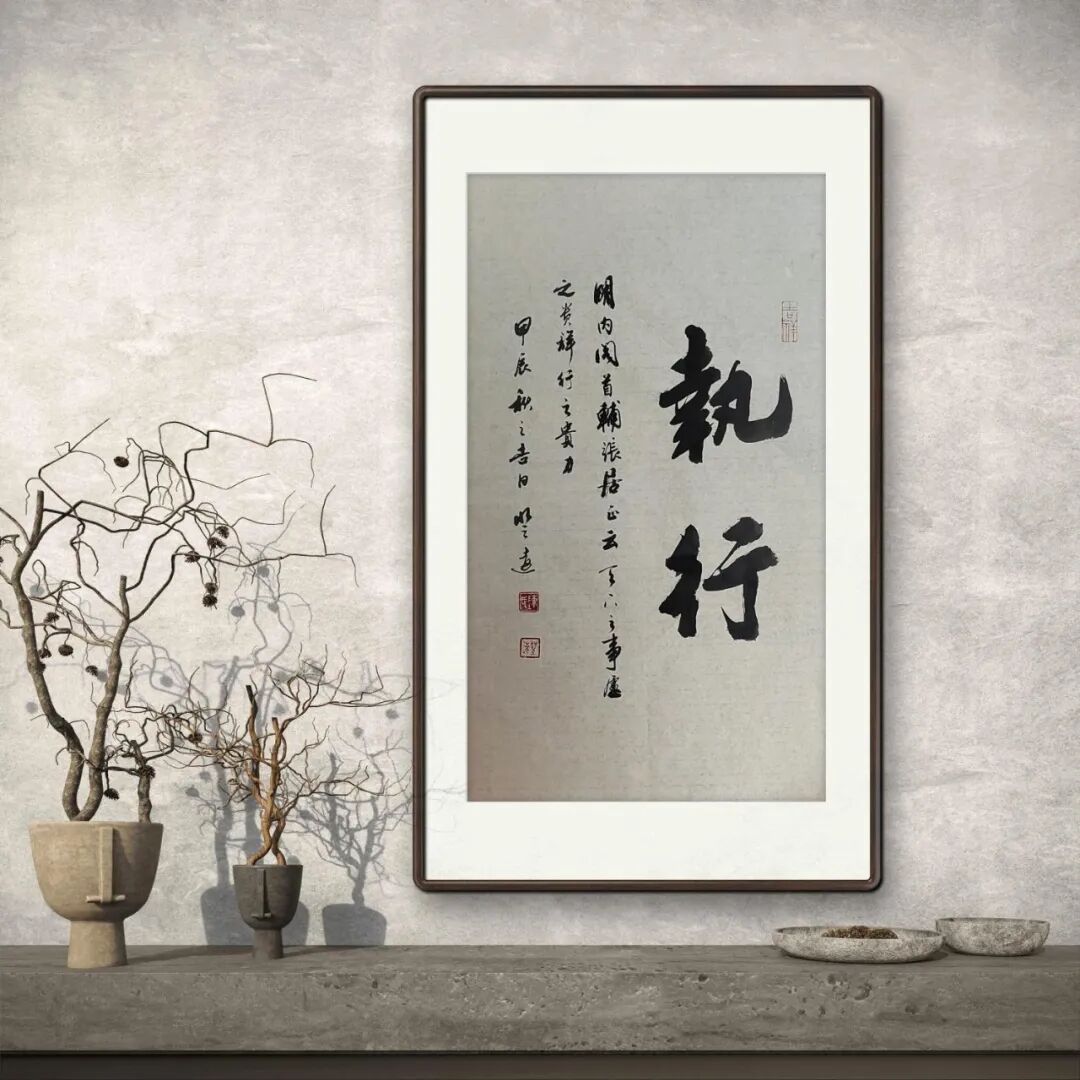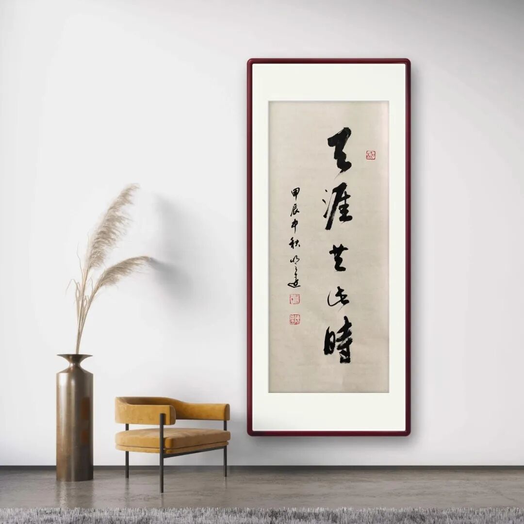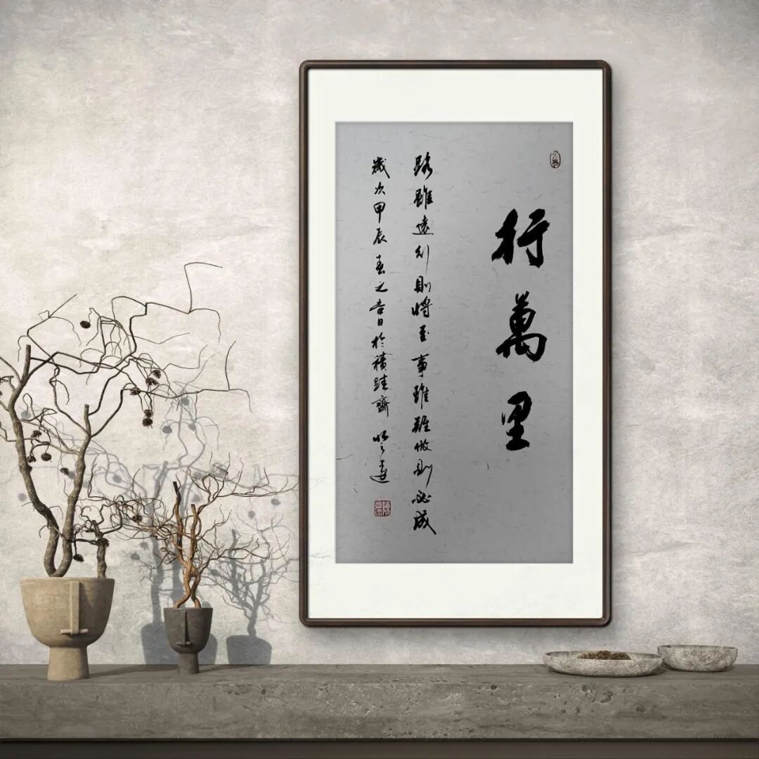 先生书法最动人者,在其刚柔并济之态。笔下线条如奔雷坠石,亦如兰叶拂风,直画如剑藏锋芒,曲笔似藤蕴生机。其作品法度严谨却不囿于成规,奔放自如而不失沉稳,厚重处见筋骨,飘逸处显灵动,真正做到了骨肉相济、动静相宜。字形正倚交错,大小开合间尽显跌宕之趣,浓淡枯湿的笔墨变化,让每一幅作品都充满韵律感与生命力。