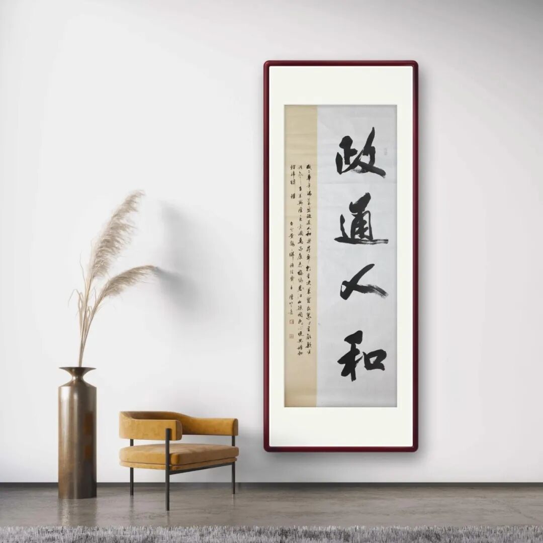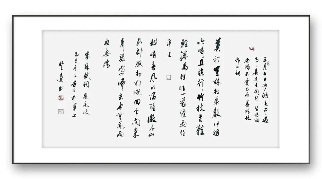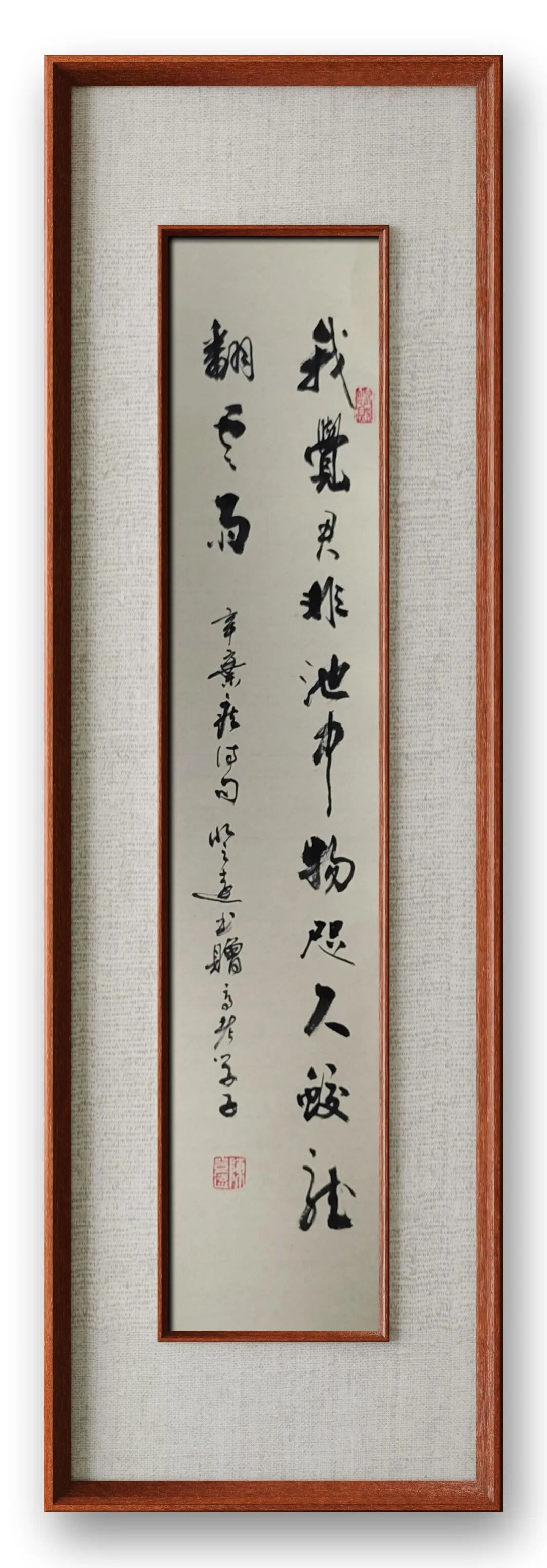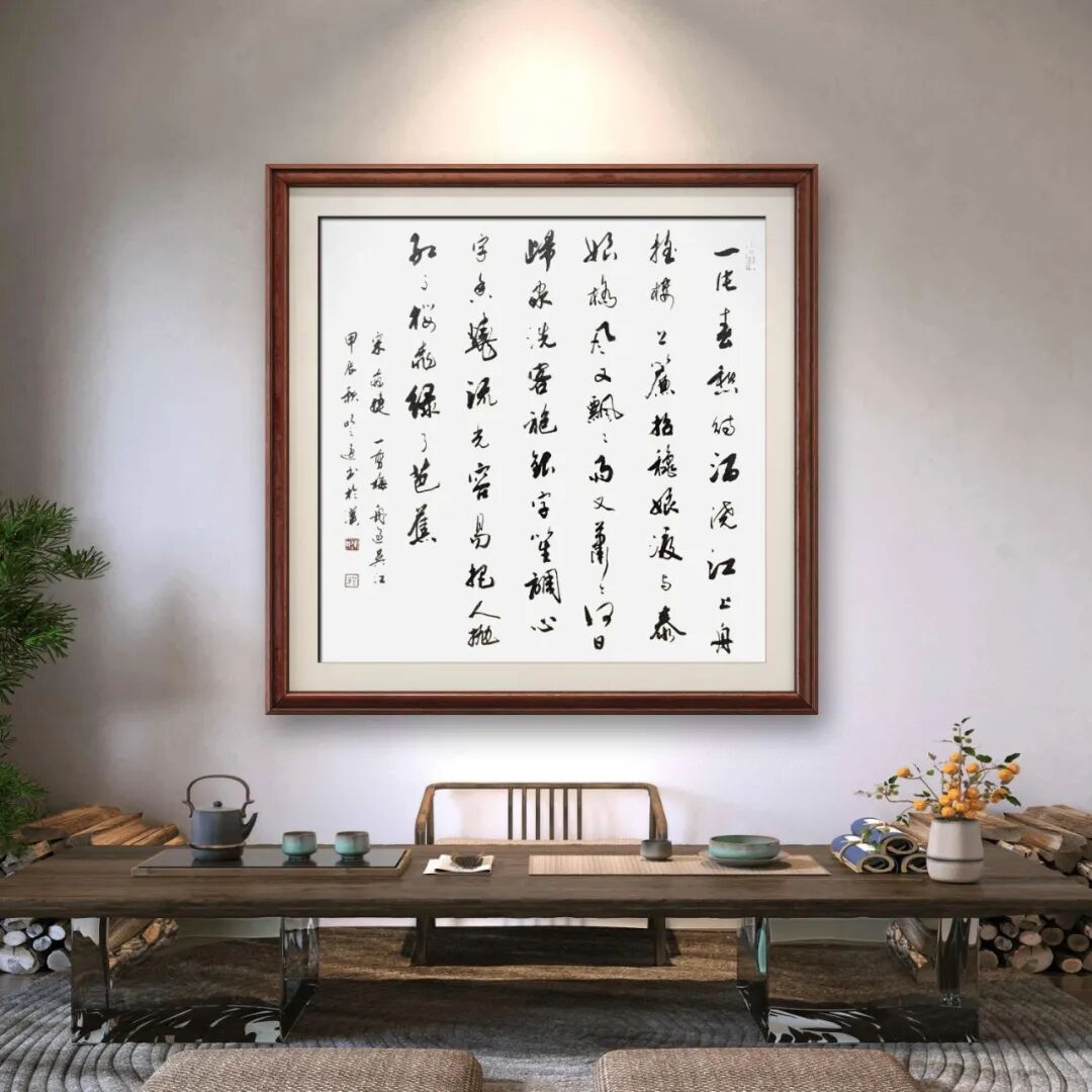 先生书法最动人者,在其刚柔并济之态。笔下线条如奔雷坠石,亦如兰叶拂风,直画如剑藏锋芒,曲笔似藤蕴生机。其作品法度严谨却不囿于成规,奔放自如而不失沉稳,厚重处见筋骨,飘逸处显灵动,真正做到了骨肉相济、动静相宜。字形正倚交错,大小开合间尽显跌宕之趣,浓淡枯湿的笔墨变化,让每一幅作品都充满韵律感与生命力。