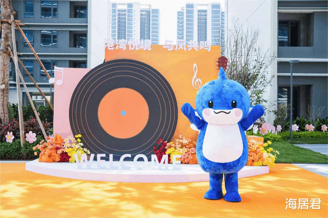 园区里黑胶唱片主题的打卡景墙错落排布,业主们都纷纷在此合影打卡,俏皮的蓝色“布鲁”站在一旁,时不时和路过的小朋友挥手互动。