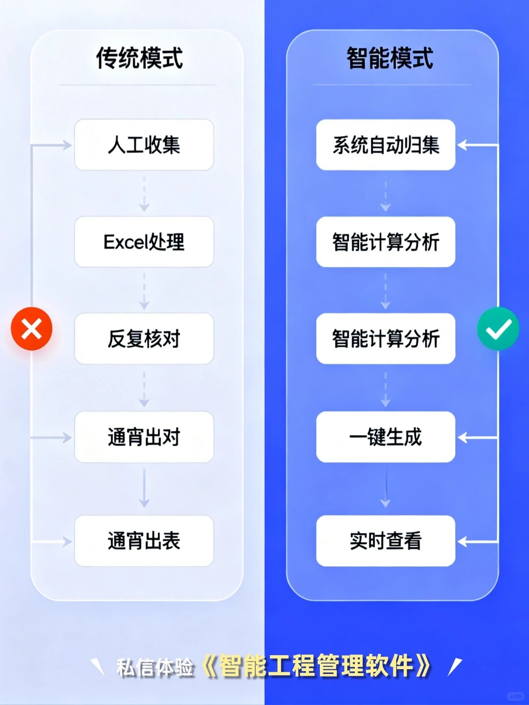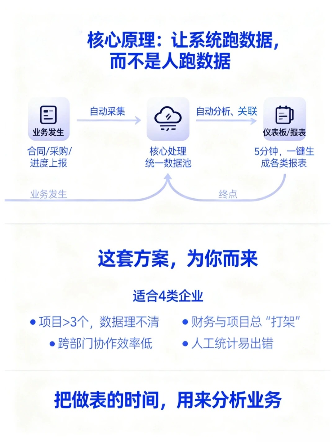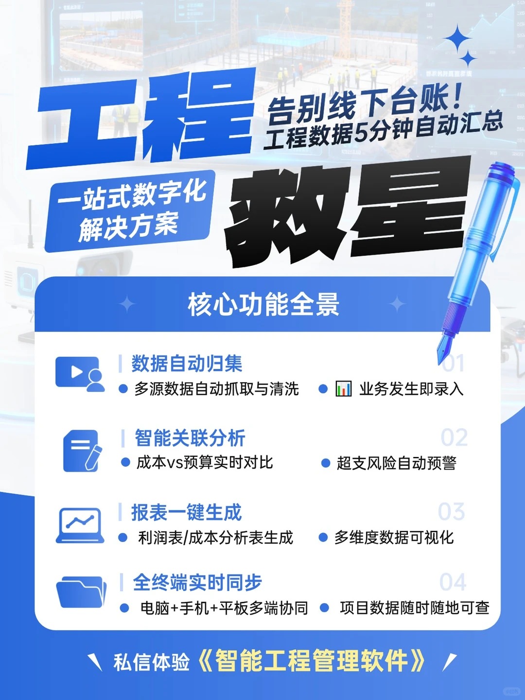 通宵做表、数据打架、老板催命… 月底为了几张报表,财务和项目部又要“干架”了?🤯 别再折磨自己和同事了! 工程数据汇总,真的可以不用这么苦… - ❌ 传统模式:人工地狱 表格满天飞:数据散落在Excel、微信、纸质单里,找都找不全。 对账靠人眼:一笔钱要对合同、入库单、发票…核对到头晕。 汇总纯手工:复制粘贴易出错,月底全员加班“数豆子”。 报表总延迟:开会想看数据,结果还是上周的。 结果:管理 = 没完没了做表格,而不是做决策。 - ✅ 智能模式:5分钟自动化 数据自动抓取:业务一动(如签合同、材料入库),数据自动同步。 系统自动关联:成本、收入、合同逻辑后台自动匹配。 报表一键生成:项目利润、成本分析等报表,点一下全有。 实时动态更新:数据永远在线,随时可查。 - 结果: 月底对账:3天 → 1小时 报表生成:通宵 → 5分钟 管理重心:做表格 → 看数据、做分析、做决策 终于可以:准时下班,用数据说话 - 💎 核心原理很简单 让系统跑数据,而不是人跑数据。 一次录入,全程复用;业务发生,数据自动归集。 - 🏗️ 适合哪类工程企业? ✔ 项目多、周期长:同时跟进多个项目,数据易混乱 ✔ 成本控制难:材料、分包、机械费用理不清 ✔ 业财不同步:业务与财务数据总对不上 ✔ 追求精细化管理:希望用数据驱动决策,而非凭经验 - 如果你也想: ▷ 把做表的时间,用来分析业务 ▷ 把对账的精力,用来管控成本 ▷ 把模糊的感觉,变成清晰的数字 - 现在就可以改变。 你的团队,每月花多少时间在数据汇总上? 快来体验数字化工程管理软件