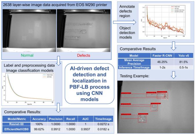 相关研究创建了一个基于人工智能的金属粉末床熔融监控系统,利用深度学习逐层分析图像。该研究首先构建了一个全新的标注数据集,并评估了各种卷积神经网络架构的故障识别能力。研究结果表明,ResNet-50和EfficientNet两种人工智能模型能够以超过99%的准确率对粉末床图像进行分类(正常或缺陷),YOLOv5网络在识别缺陷点(例如飞溅、不完全熔融)方面比传统的Faster R-CNN方法更胜一筹。这验证了深度学习在实时异常检测方面的潜力。