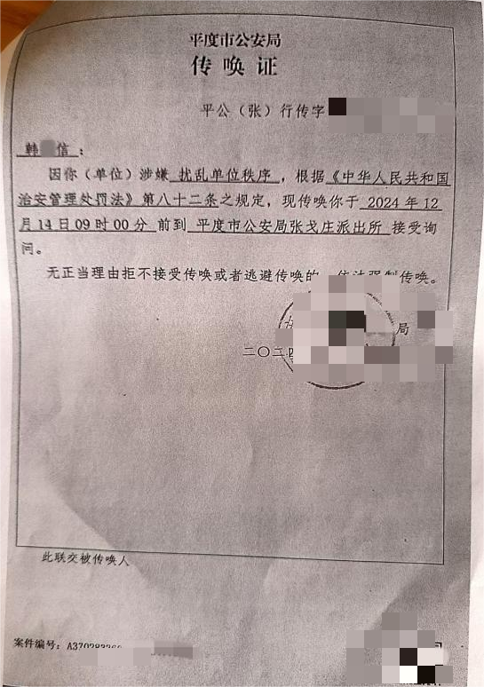 更令人愤慨的是,信访过程中,韩某还曾遭遇多项不合规对待:2022 年起,张某某派出所相关人员在无上级文件依据的情况下,对其实施监控、查询活动轨迹;2024 年12月,其被以 “扰乱单位秩序、寻衅滋事” 为由拘留五天五夜,韩某称该处罚缺乏事实依据;平度教体部门相关负责人孙某还在信访途中作出不当表述,阻挠其合法信访。