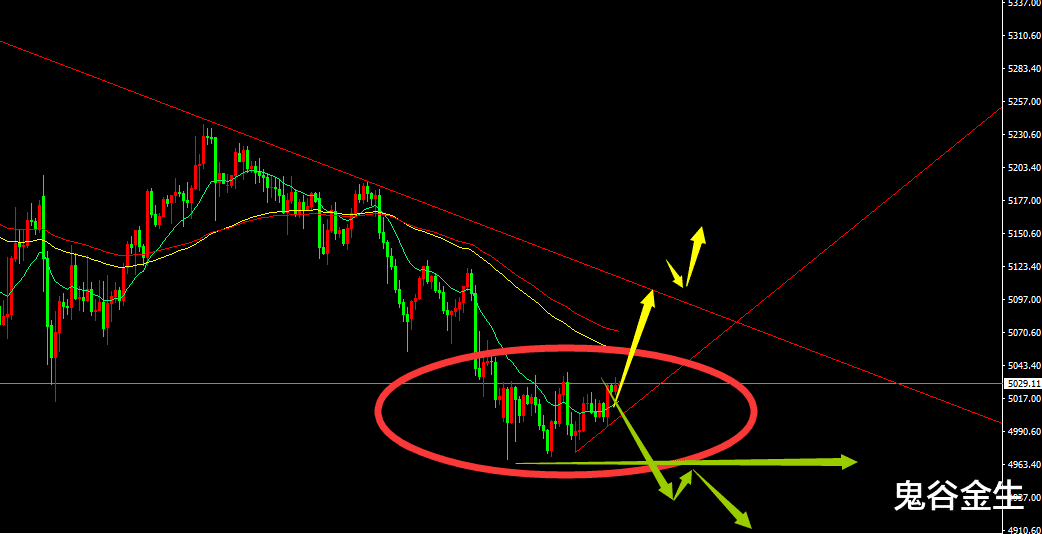 操作上继续持有昨日5000的多,今日5005附近或现价继续多进去,目标看5100,防守5000之下,记住如果今天再次跌破5000,那么金价将继续走弱,届时就是考验4960的支撑了;