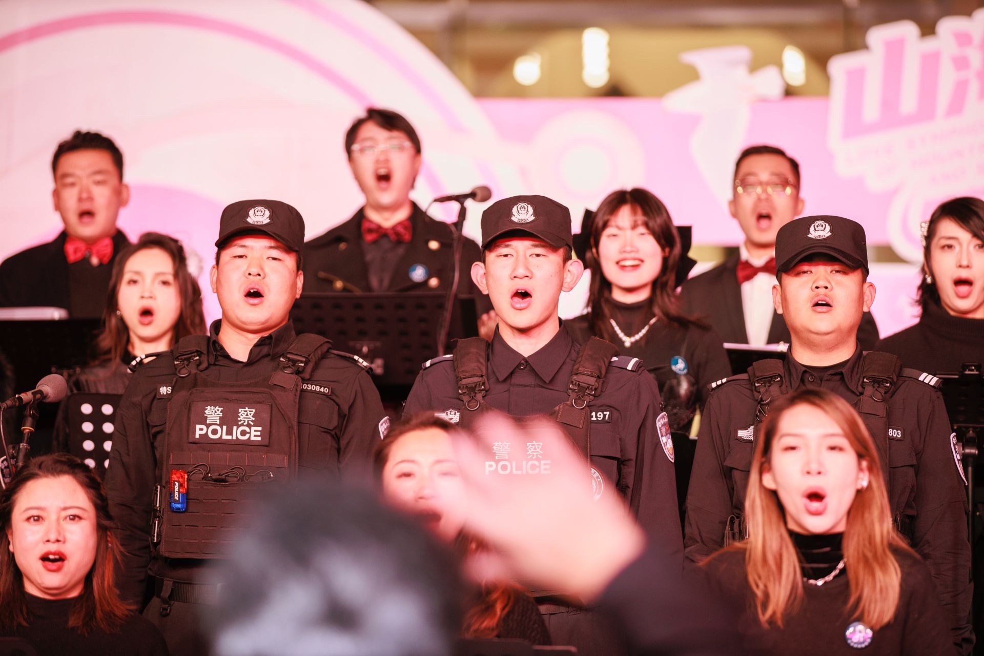 当晚的演出中,一段特殊的合唱让现场气氛格外热烈。在《祖国不会忘记》激昂的旋律中,一群身着制服的警察悄然加入合唱团,整齐的队列、庄重的神情与深情的演唱,瞬间点燃全场。当天恰逢第六个“中国人民警察节”,本该休假的他们依然坚守岗位,在现场执勤护航。演出间隙,小朋友们捧着鲜花走向警察叔叔,稚嫩的问候与真挚的敬意让现场暖意融融。现场有两位警官通过防诈小问答、赠送警察小熊的形式普及反诈知识,“陌生链接不点击,可疑来电多核实”,互动问答引发市民激烈抢答,在轻松氛围中筑牢安全防线。