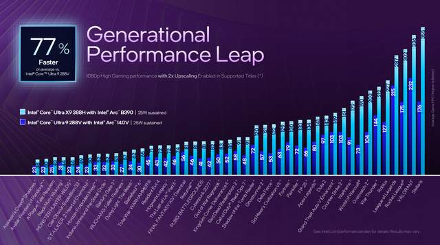 官方放出的实际测试数据更让人大跌眼镜。在45W TDP的功耗下(比主流独显低15W),Ultra X9 388H的Arc B390核显,在1080P高画质+XeSS性能模式下,45款游戏平均帧率比上一代Lunar Lake提升77%,比AMD HX 370的RX 890M快82%,甚至比NVIDIA 60W的RTX 4050 Laptop还快10%。