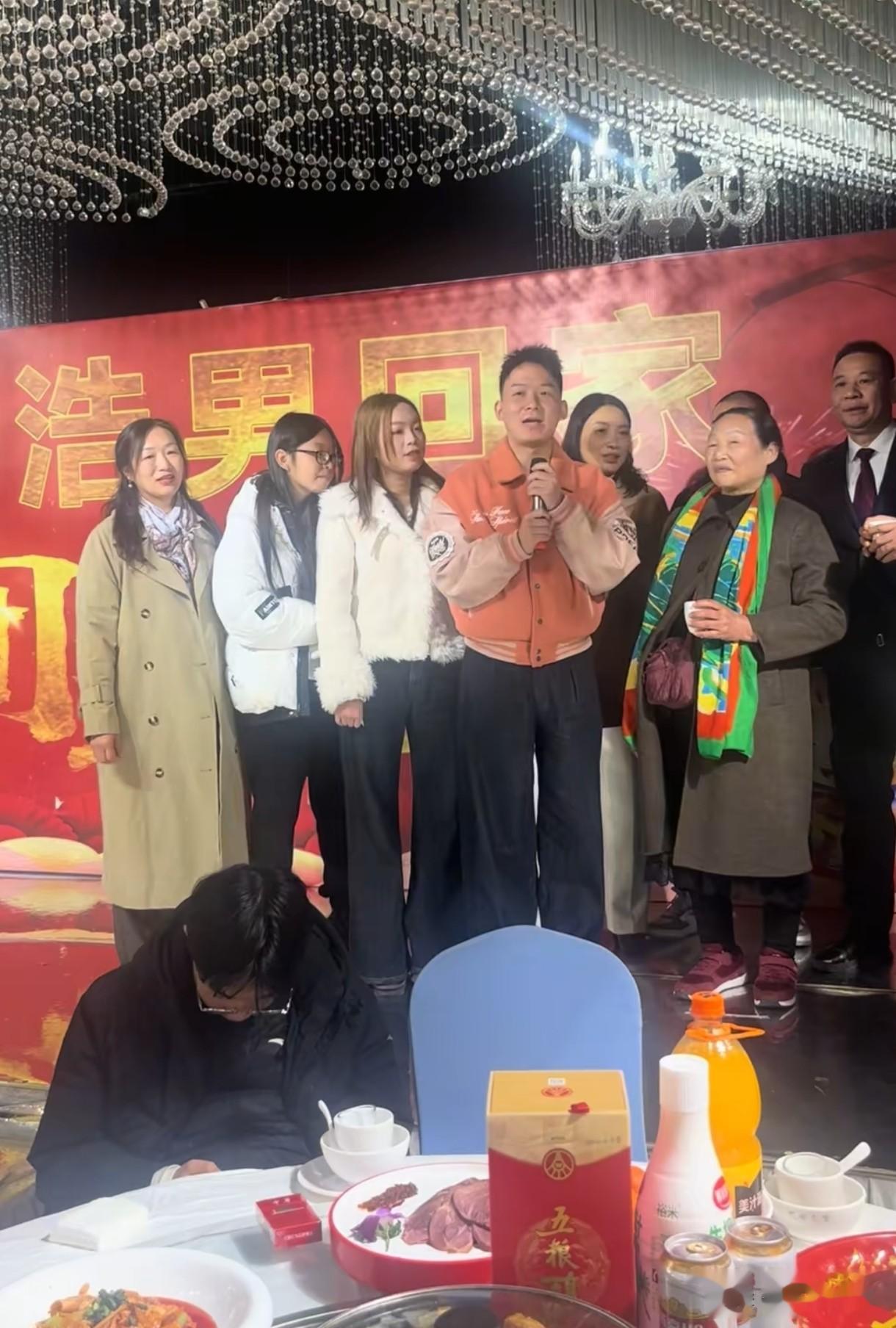 现场的牌子上写着几个大字“欢迎浩男回家”,这几个字可太有意思了!