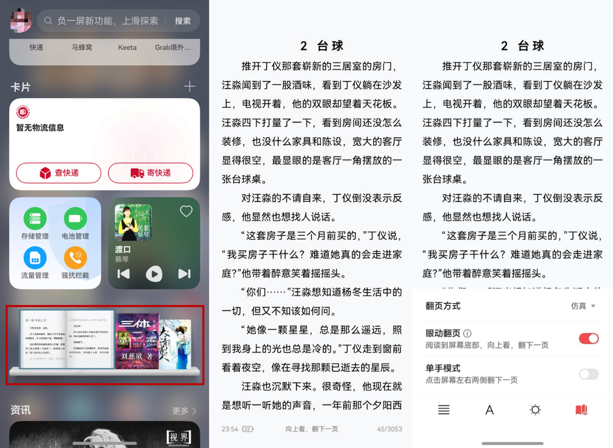 等公交、坐地铁的碎片时间,我会习惯看点东西。之前要么刷短视频,要么得专门打开某个阅读App。后来我在负一屏的添卡列表里发现了阅读卡片,就试着加上了,点开就能直接进华为阅读App。看小说的时候,我还经常开着眼动翻页功能,这功能特别适合做饭、吃鸭货这种腾不出手的场景。