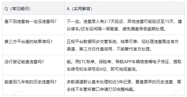 租车场景:还车时当场用第三方平台或自助机查违章,无违章再签字确认;若租车公司后续告知违章,要求其提供违章照片和明细,核实无误后再支付罚款,避免被虚报违章坑钱。