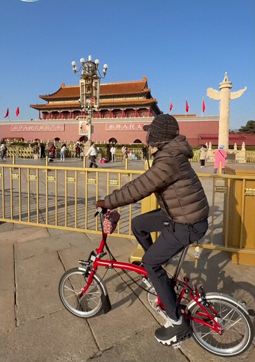 董洁裹着厚厚的羽绒服,骑着自行车沿着天安门广场一路前行。