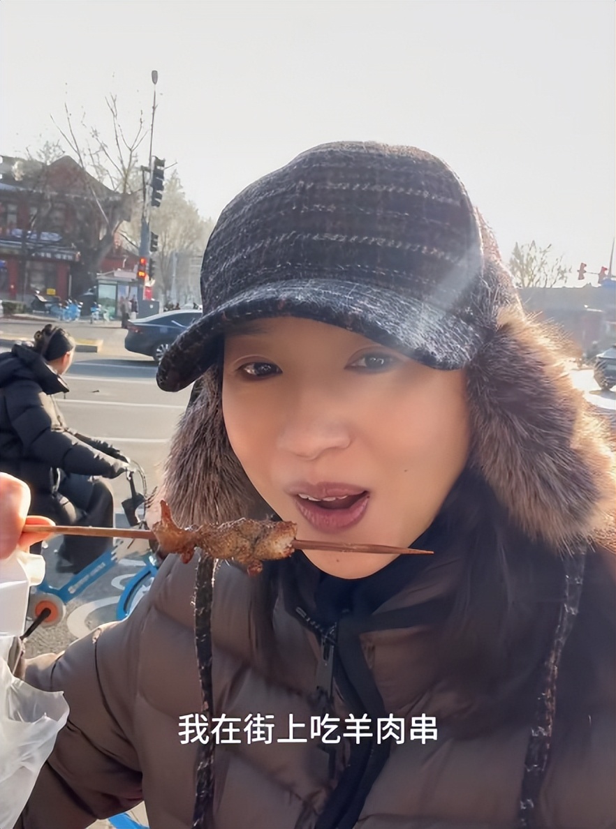这位曾经的“冷清秋”穿着价值1万7的Miumiu羽绒服,却在路边大口吃着糖葫芦和羊肉串,毫无明星架子。