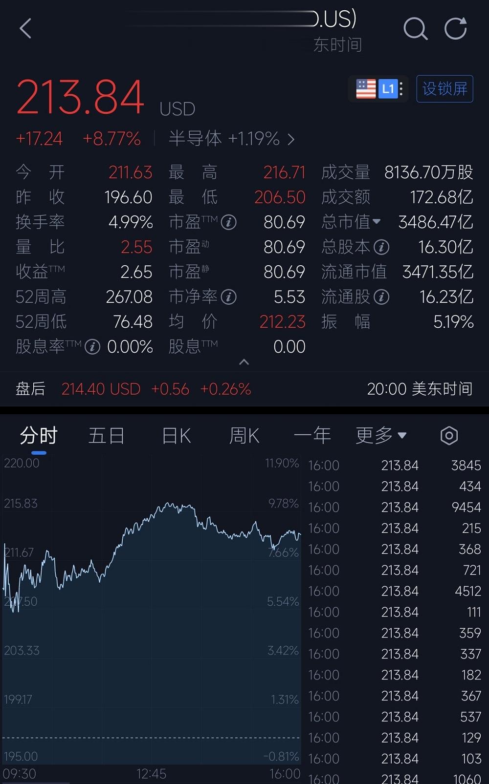 与Meta合作的消息正式公布后,资本市场迅速作出反应。美东时间2月24日收盘,AMD股价大幅上涨8.77%,报收于213.84美元/股。