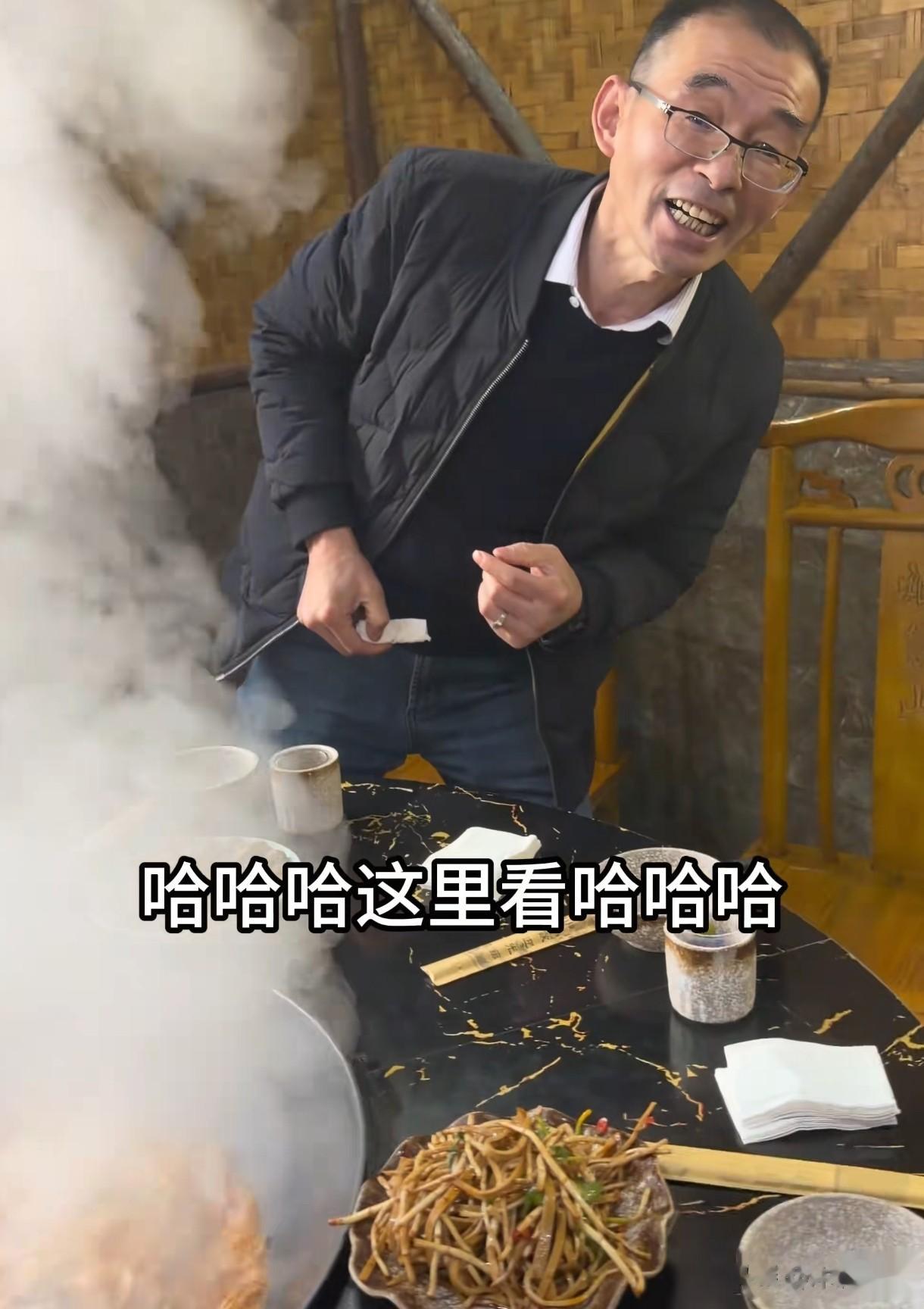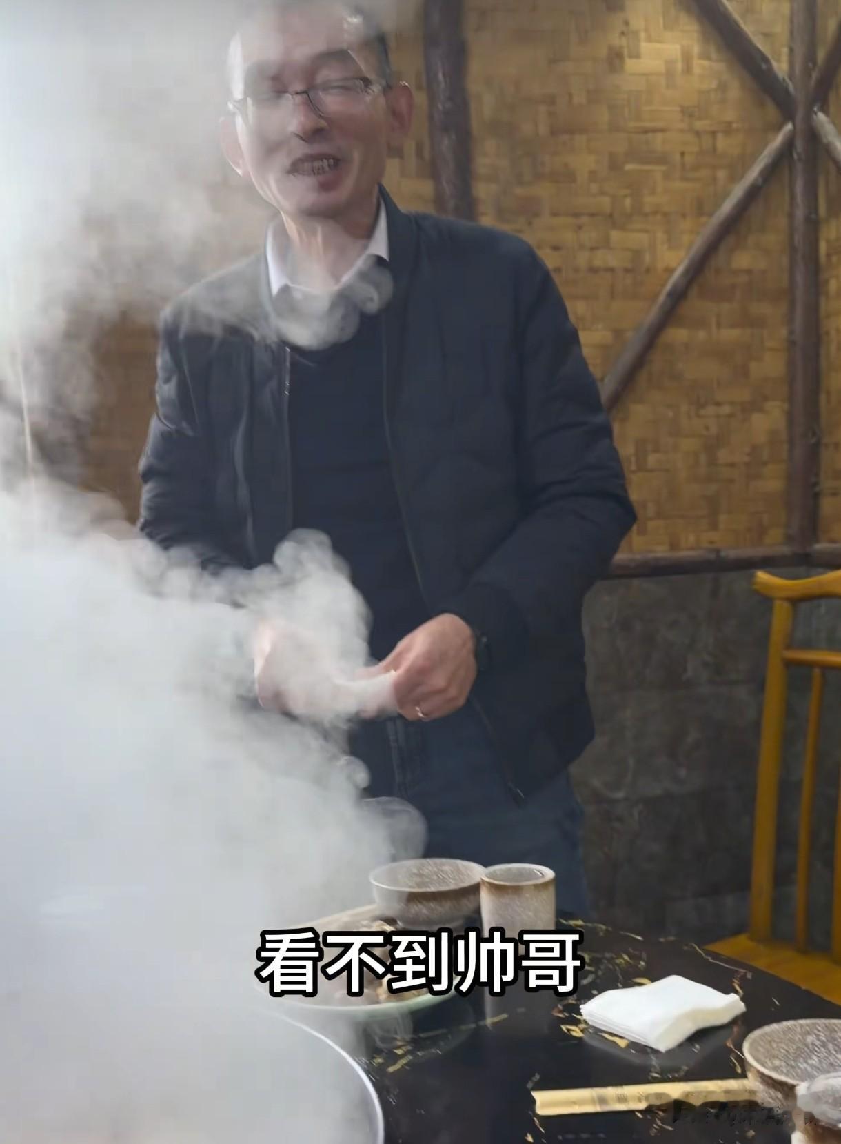 今天谢岳和王丽萍炖大鹅,大锅里咕嘟咕嘟冒着泡,烟雾缭绕中,谢岳和大锅灶对面的王丽萍看不到彼此,王丽萍说:看不到帅哥了!