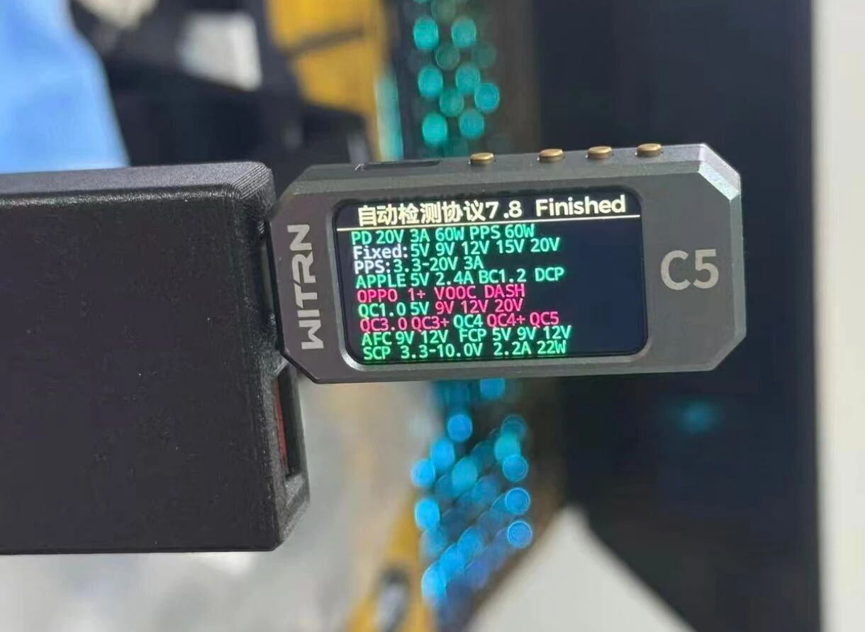 根据测试仪显示,它支持PD协议和PPS协议的60W输出,最大功率是20V/3A,还兼容APPLE、QC、AFC、SCP等协议。