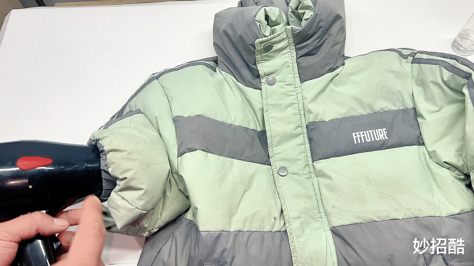 最后找出家中的吹风机,调到低温档,对着羽绒服,打湿的位置吹一下。
