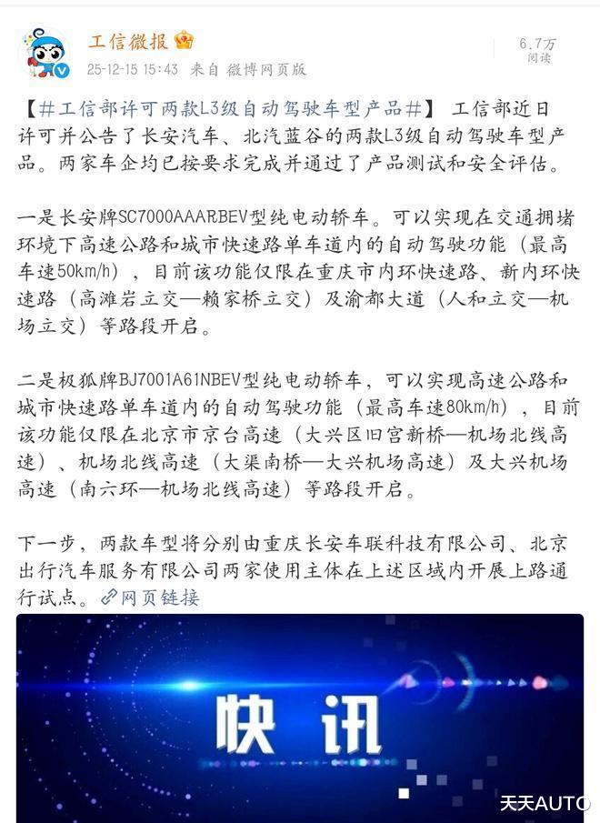 新华AUTO:12月15日,我国自动驾驶技术的发展迎来了一个重要的里程碑。当日,工业和信息化部批准了两款搭载L3级有条件自动驾驶功能的智能网联汽车产品的准入申请。这两款车型一个是长安汽车的深蓝SL03,另外一个则是北汽集团的极狐阿尔法S6。其中,深蓝SL03搭载的是长安自研的“天枢智能”系统,阿尔法S搭载的则是华为乾崑智驾ADS系统。这两款L3车型获得产品准入,意味着一件事情:我国的L3级自动驾驶技术,正式从“测试场”走入“量产落地”,进入搭载于量产车、在公开道路进行有条件商业应用的新阶段。