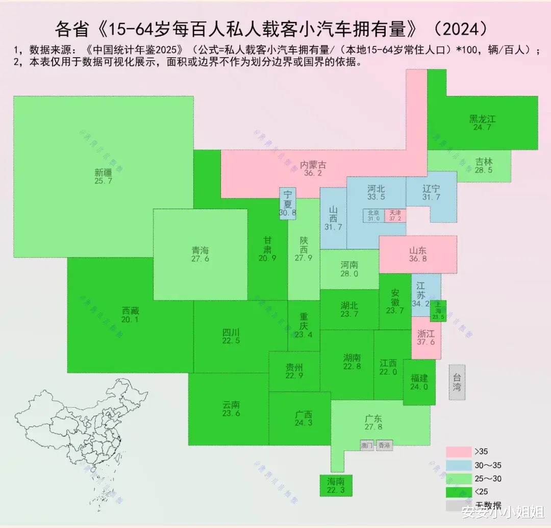 25-30 辆 / 百人的省份数量最多,涵盖了青海、广东、陕西、河南等东西部地区。