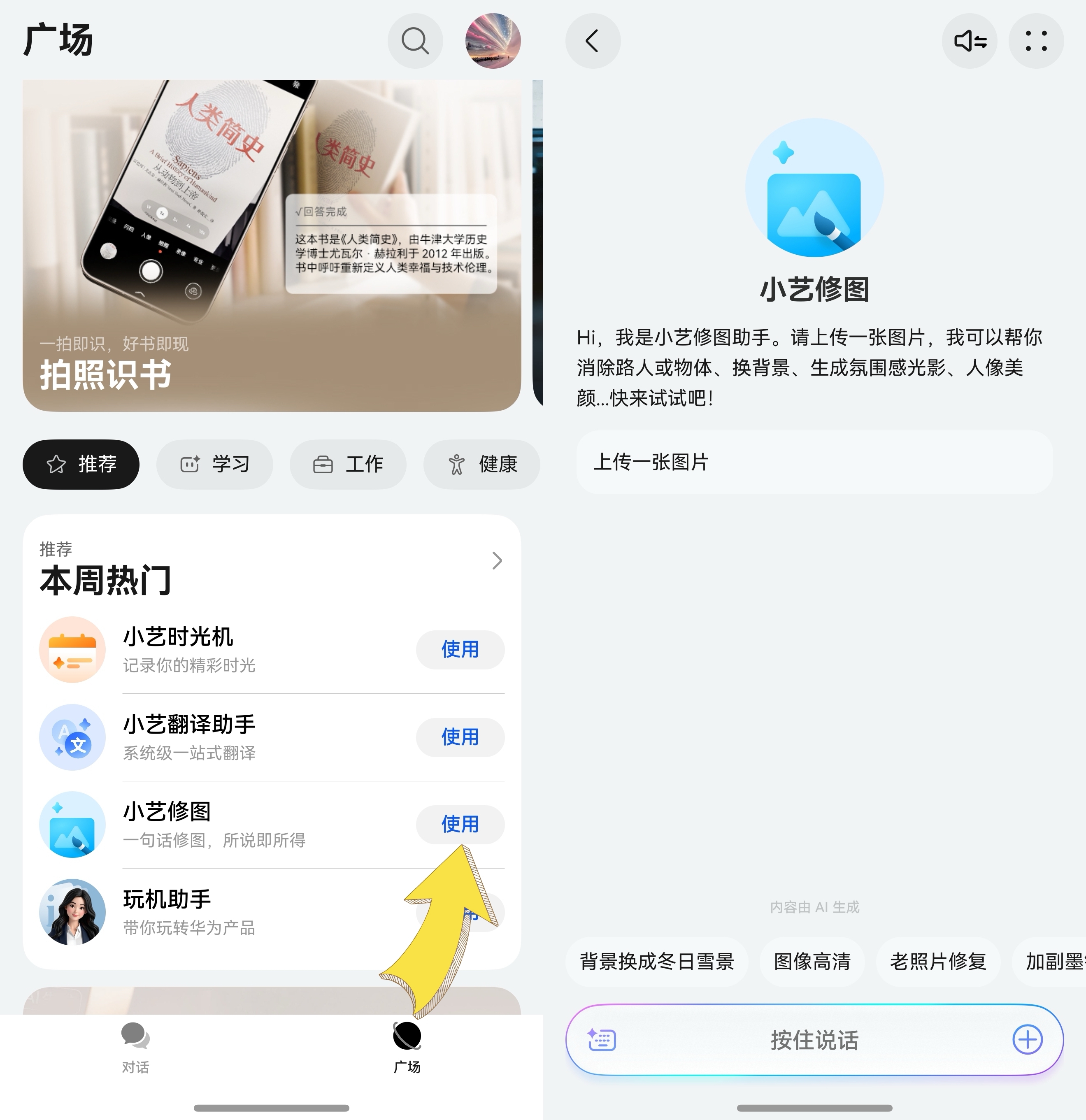 过年逛庙会或者游玩拍到的照片,想要马上发朋友圈,但背景里熙熙攘攘的游客特别影响观感。别慌!只要在图库里找到照片,长按桌面底部导航条唤醒小艺,直接说“消除背景路人”,短短几秒,照片里的闲杂人等就会全部消失,让画面更加干净,这波修图效率简直原地起飞。大家也可以在小艺App里点击底部“发现”进入广场,右上角搜索图标输入“小艺修图”,打开后再点击右下角加号按钮上传照片,就能体验AI消除功能,另外也可以把其他想要消除的区域进行二次涂抹,实现精细化消除,简单又快捷。