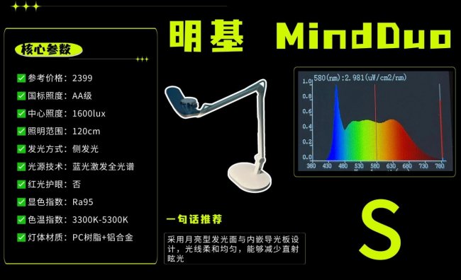 学生护眼台灯哪个品牌好?明基MindDuo它的优势体现在功能方面,支持亮度侦测自动调光,可将光线稳定在舒适范围,不用手动反复调节。同时色温方面它拥有3300K-5300K可调范围,能满足孩子读写、绘画等多样化用光需求。不过也有需要注意的地方,它采用的是传统蓝光激发全光谱技术,这类技术的台灯,有害短波蓝光通常偏高,从光谱图能看到,其有害蓝光峰值约1.0,实话说这个表现在千元级台灯里算不上出色。而且明基MindDuo的光谱连续性也一般,存在明显高峰,也没有额外添加红光增益等养眼功能。