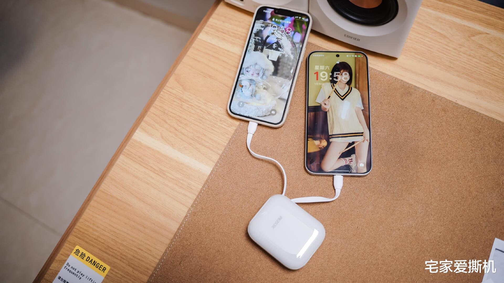 对于充电速度,最直观的感受来自实际补电场景。先看iPhone13,这款搭载3227mAh电池的机型,最高支持20WPD快充协议,用西圣PB-S的自带Lightning线连接,从15%低电量开始充电,前30分钟就能充至53%,刚好满足通勤路上的应急需求,刷着短视频的同时电量稳步回升,完全没有“越充越慢”的尴尬。继续充至满电耗时约1小时45分钟,符合官方标注的快充效率,满电状态下能给iPhone13完整补充2.3次左右,日常通勤两天一充毫无压力。