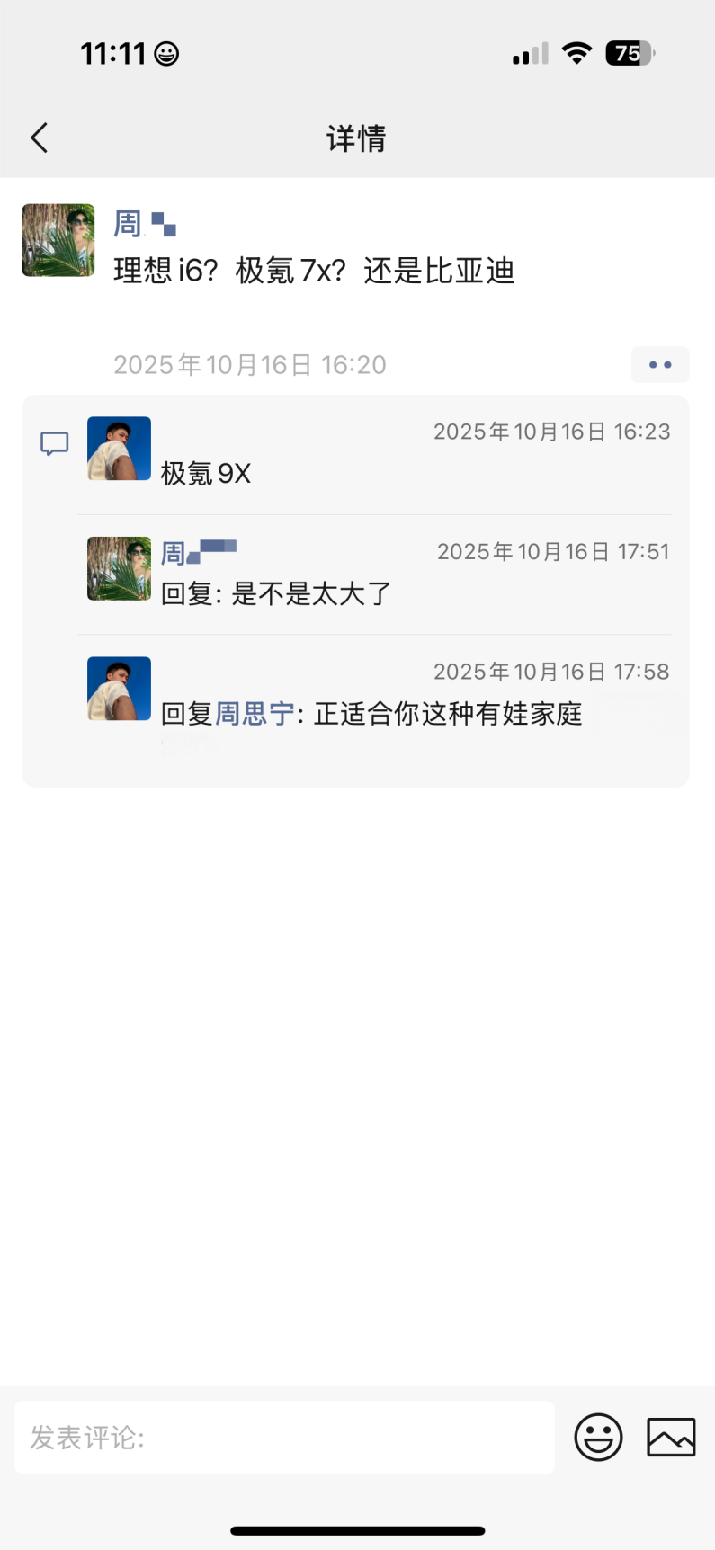 事情是这样的,去年十月底,我一个学姐发PYQ纠结买车,我随手评论安利了极氪9X。