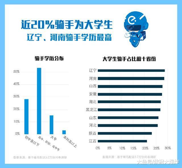 近20%蜂鸟骑手为大学本科或专科生,其中辽宁省、河南省拥有大学学历的骑手占比全国领先。