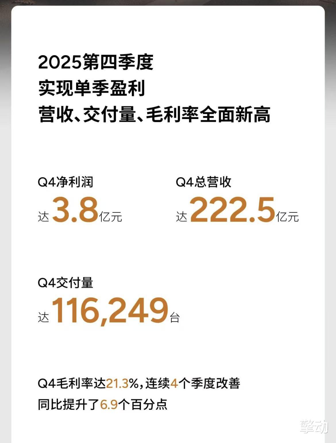小鹏汽车也盈利了,2025年第四季度净利润达3.8亿元。这个数字放在整个汽车行业不算什么大数字,但对小鹏来说,这是成立以来的第一次单季盈利。