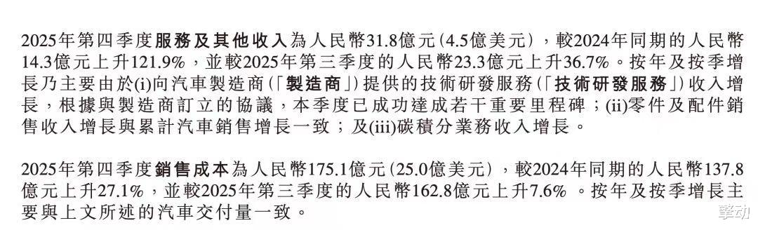 更值得玩味的是,这笔钱不能算是“卖车”赚来的,毕竟同期汽车销售毛利率只有13%,真正把利润拉上去的,是那项毛利率高达70.8%的服务以及其他收入。财报里也写得很清楚,这部分收入主要来自“向汽车制造商提供的技术研发服务”,简单说就是——卖代码。