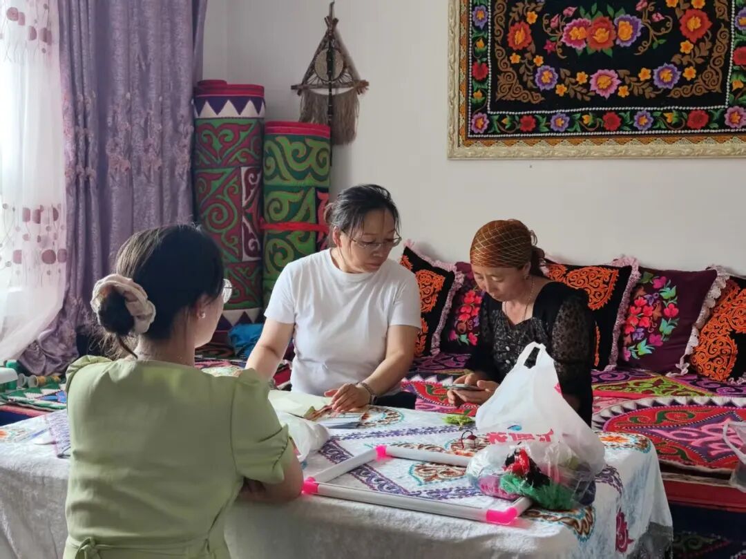 娜孜古丽是村里最早响应的妇女之一,不仅自己全身心投入,她还主动召集周边会刺绣的邻里姐妹,一同参与产品开发,共同制作牧草刺绣挂饰。