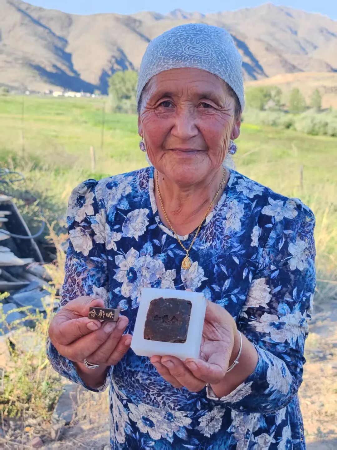 询问得知,这是用当地常见的植物晒干后烧成灰,制成原料,加入羊尾油熬制的黑肥皂,除了日常清洁,民间还用于治疗湿疹、发热,是哈萨克家庭世代相传的天然用品。