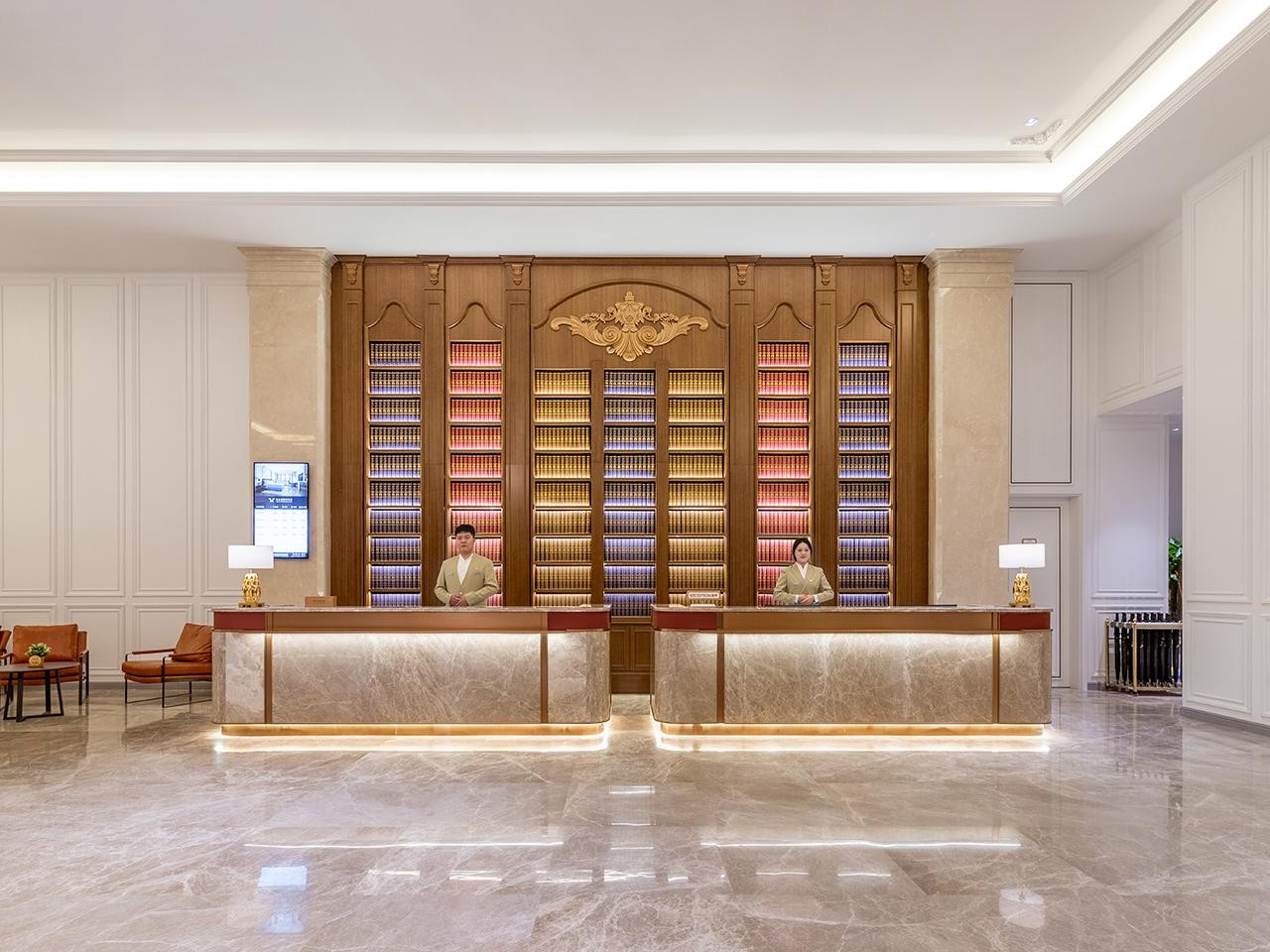 作为维也纳经典版的匠心之作,酒店大堂以“经典艺术,尊崇体面”为核心,将欧式古典美学与当代舒适体验融合,构建兼具仪式感与松弛感的旅居空间。大堂以对称布局与暖色系营造典雅迎宾氛围,柔和灯带映照大理石地面与精致细节;壁炉的温暖意象与拱形窗的复古线条相映成趣,前台、休息区与休闲区布局合理,既保证动线流畅,又形成可停留、可社交的复合场景。书架与艺术陈设延续维也纳“金色大厅”的文艺意象,水晶吊灯与木质肌理交织出明亮而雅致的光影层次,令宾客步入酒店的瞬间,即沉浸于艺术与历史交织的度假心境,完成从城市喧嚣到静谧休憩的自然过渡。