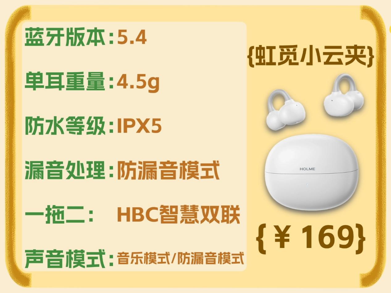 这款耳机的耳挂设计挺用心的,采用2.5mm错位设计,让喇叭和电池形成自然的高低差,戴得特别稳。不管是跑步还是跳绳,耳机都不容易滑落。电池部分是∠12弧形耳托设计,能牢牢贴合耳背,就算戴久了也不会觉得硌得慌。而且单只耳机才4.5克,戴一整天都轻飘飘的,完全没负担。音质方面更是惊喜,喇叭内置13mm石墨烯科技振膜,石墨烯材质的弹性超棒,音色细腻自然,能还原音乐原本的质感。再加上H-zone全景空间音效,听感上的氛围感拉满,配合虹觅声学实验室的专业调音,高中低音分布得很均衡,高音清亮不刺耳,低音扎实有劲儿,百元价位里真没几款能在音质上比得过它。性能表现也很靠谱,搭载蓝牙5.4芯片,连接又快又稳,不容易断连。漏音处理用的是虹觅自研防漏音模式,能挡住98%的声音外漏,不管是通勤路上还是在图书馆使用,都不用担心打扰到别人。还支持HBC智慧双联功能,能同时连接两台电子设备,工作时切换接电话不用重新配对,特别方便。IPX5级防水设计,运动时大汗淋漓也不怕进水损坏。单耳续航8小时,搭配充电仓总续航能到8+24小时,日常使用完全够用。双麦克风ENC通话降噪,能精准拾取人声,就算在嘈杂环境里打电话,对方也能听得明明白白。这款耳机各方面表现都很均衡,没有明显短板,性价比是真的高。。