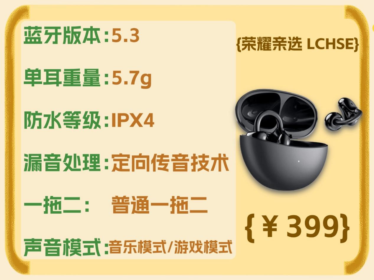 荣耀亲选 LCHSE的单个耳机的重量在5.1克,还有C形桥设计和轻量化设计能更好的优化佩戴不适感。轻盈佩戴的同时能牢固在耳朵上。耳机拥有10.8mm双磁路喇叭和动态低音增强技术,能提高空气感和通透声的同时氛围感体验也不错,耳机搭配了双麦ENC降噪功能的同时还装载了5.3版本的蓝牙芯片,7小时的单耳续航并且搭配耳机仓能来到36小时的续航时长。