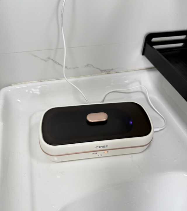 还有一个亮点是机身配备了UVC紫外线除菌模块,清洗的同时还能完成消毒。对于同时清洗多副眼镜、耳饰、隐形眼镜盒等贴身物品的人来说,这项功能能有效降低交叉污染,做到真正干净、安全。